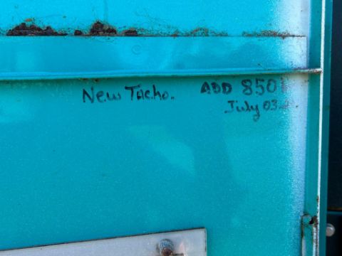 Hour meter currently reads approximately 1,337 hours. Interior marking indicates tachometer was replaced in July 2003 and 850 hours were to be added at that time.