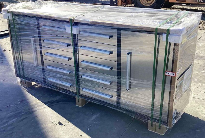 Unused 2024 7FT Work Bench with 10 Drawers & 2 Cabinets. 87*23*39 inch. Packed in Plastics. Drawers with lock and Anti-slip inners. Using new 3 rail sliding. Stainless steel