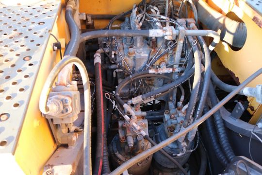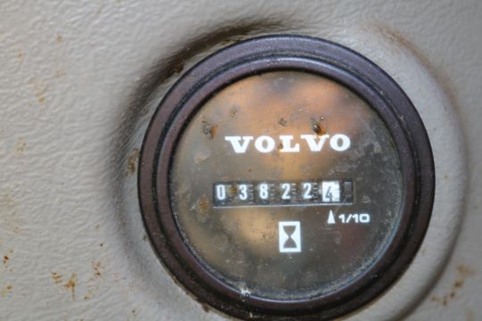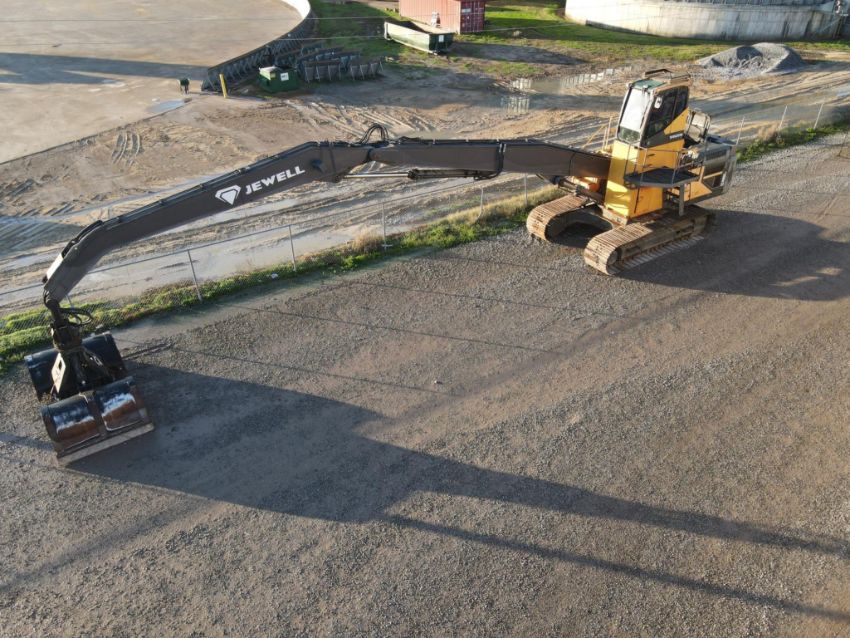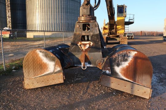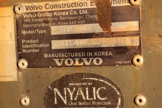 Volvo EC480EL Excavator (Material Handler with Clam Shell Bucket) track width 35.5in, width between track 72in, overall width 143in, overall height 220in, suspension seat, 3822 hours, clam shell bucket 360 rotation, undercarriage 90%, boom grease bank, surface rust located throughout, hole rusted through on right rear compartment panel.