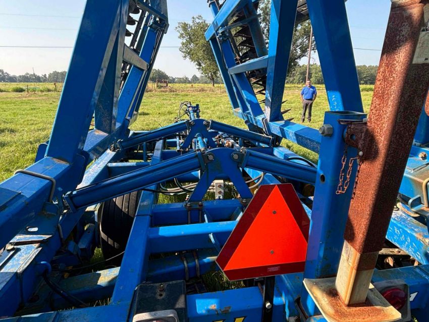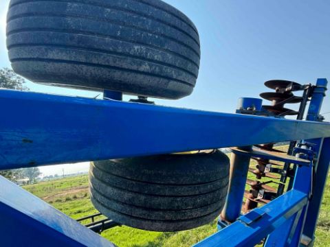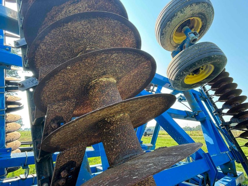 29' total width, 26'10" front gang width, 48 bladed front gang, 50 blade rear gang, 7" spacing with scrapers. Disc blades are 20" and 22" currently, Walking tandems, CAT IV hitch standard, Self leveling with hydraulic adjustment, Adjustable spring loaded down pressure (manual), Requires 240hp+.