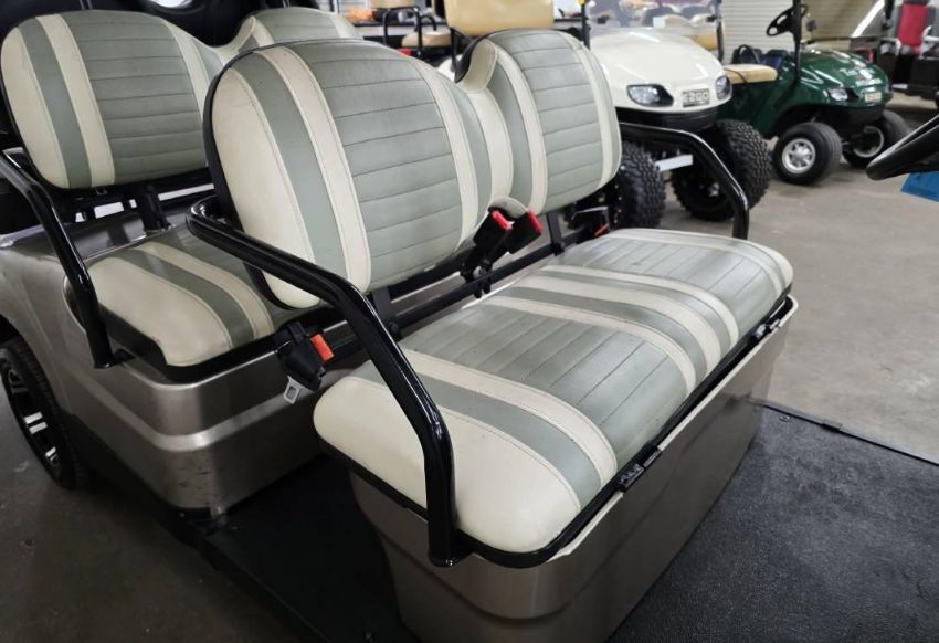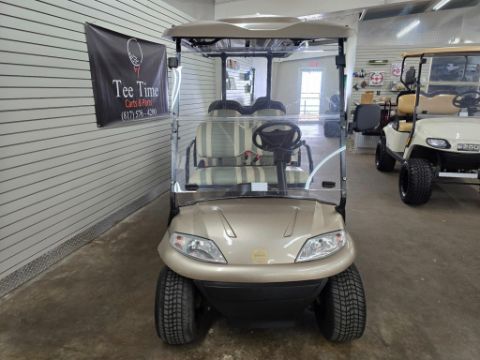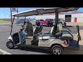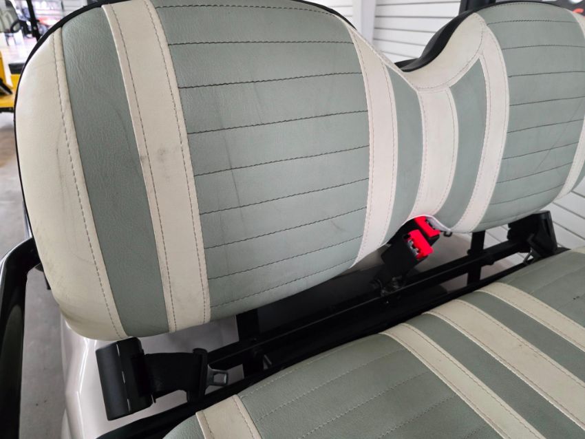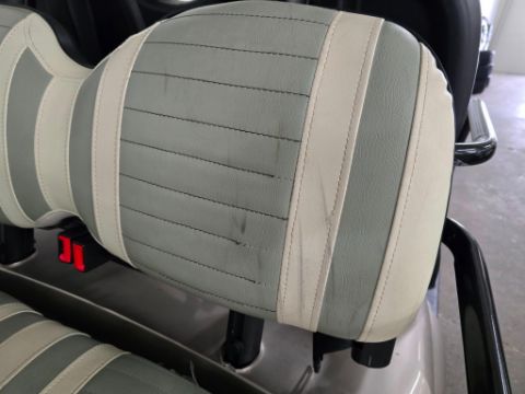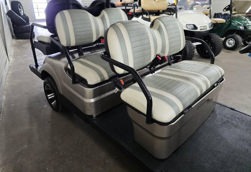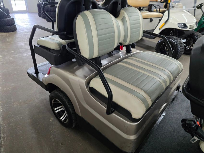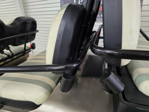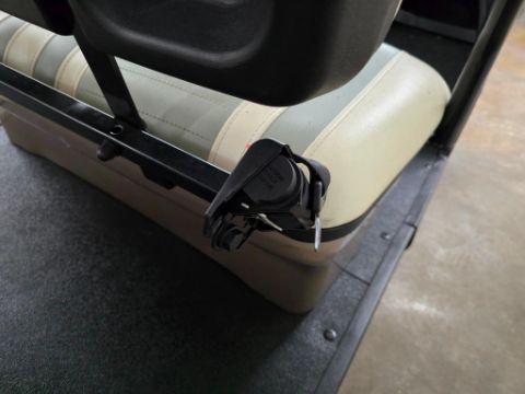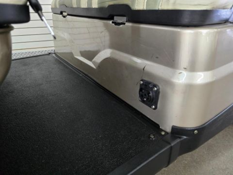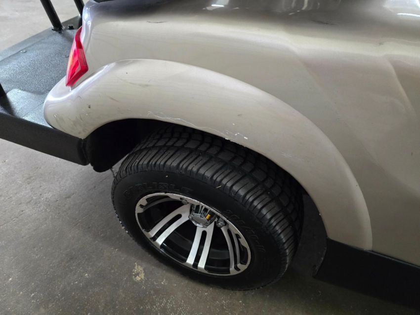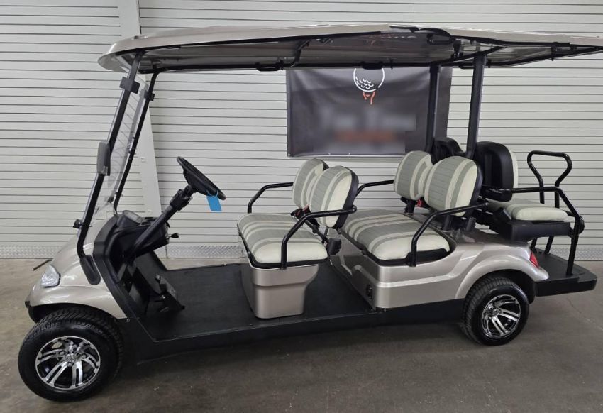This 22MPH, 48V, 6-Passenger champagne colored golf cart has a number of safety features, including seat belts, a parking brake, and LED headlights and taillights. Please NOTE: Cart was driven into low clearance area leading to cosmetic damage on roof that does not in any way affect operation of vehicle.