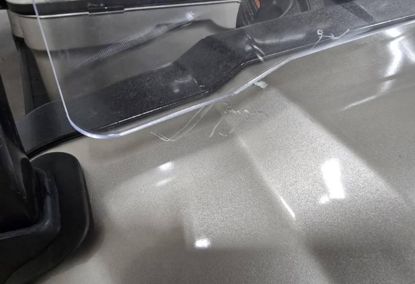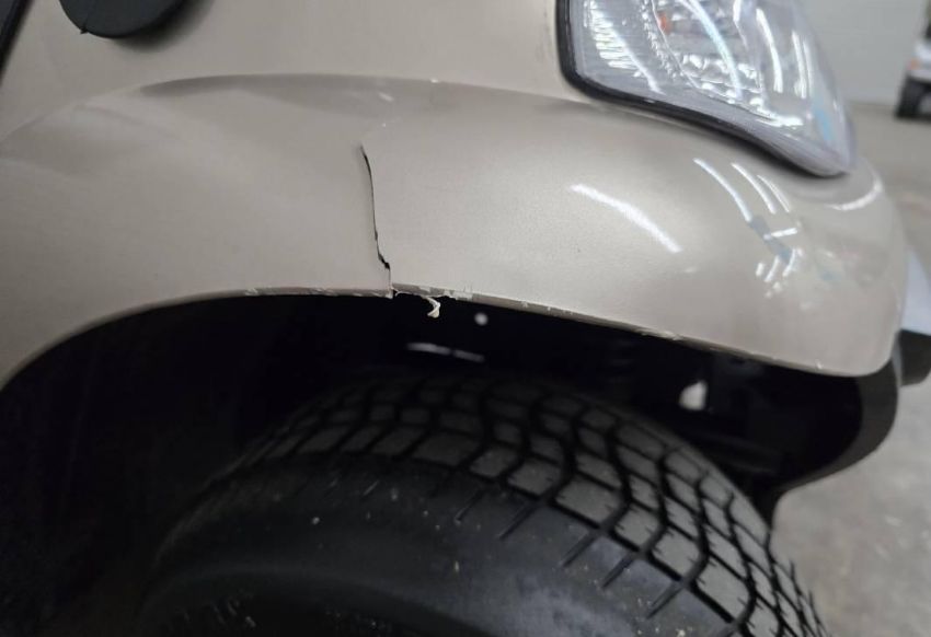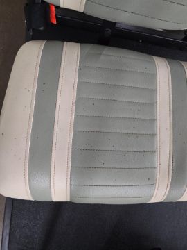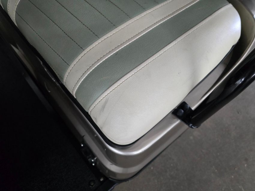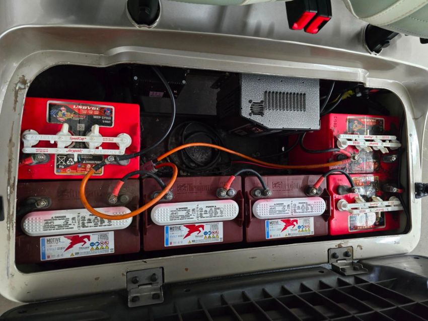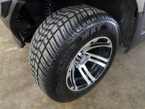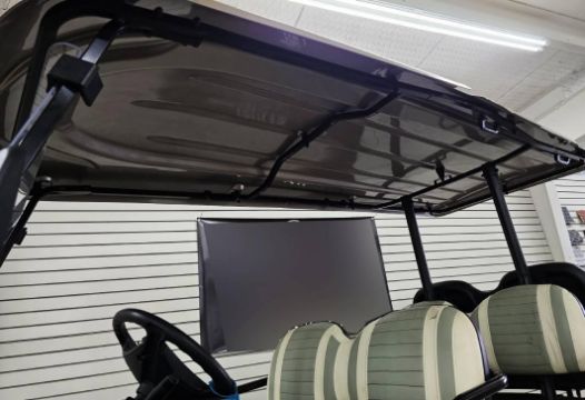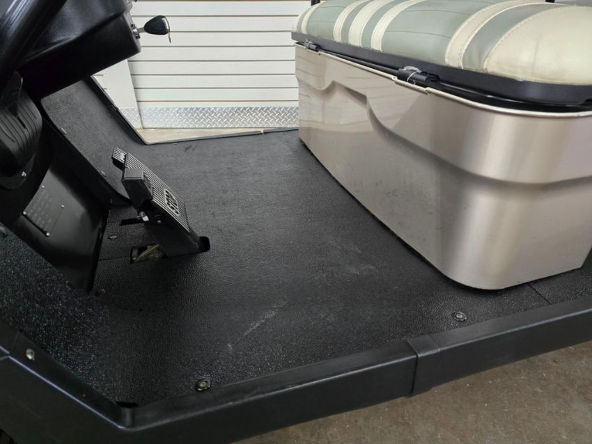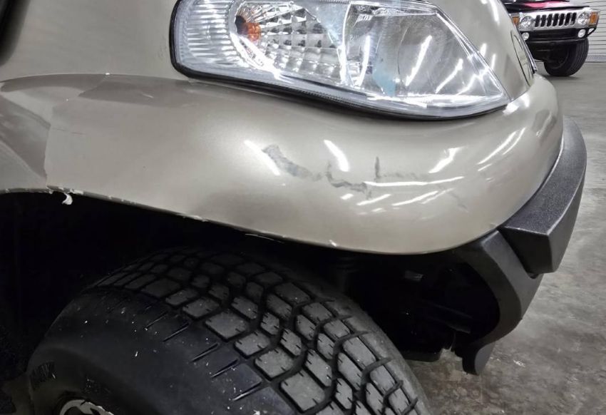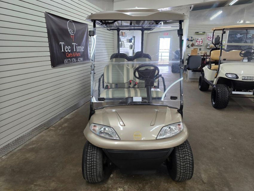 This 22MPH, 48V, 6-Passenger champagne colored golf cart has a number of safety features, including seat belts, a parking brake, and LED headlights and taillights. Please NOTE: Cart was driven into low clearance area leading to cosmetic damage on roof that does not in any way affect operation of vehicle.