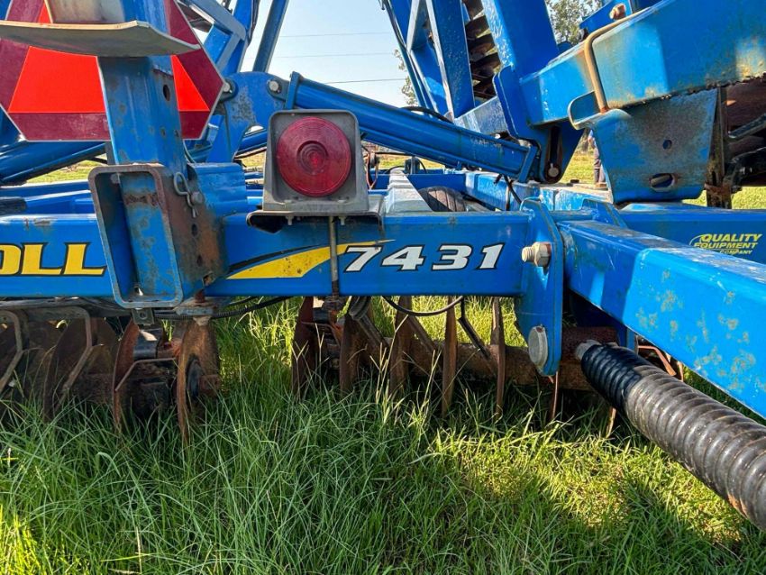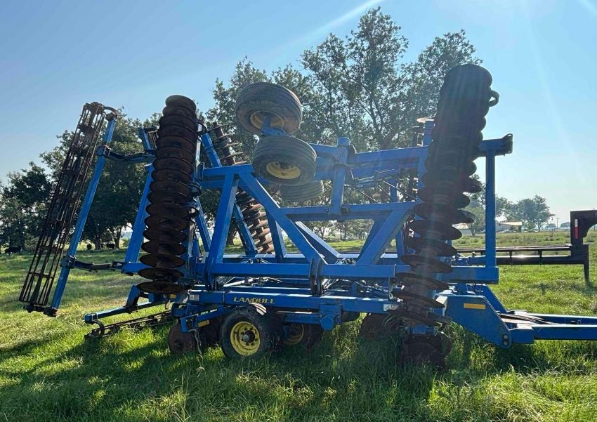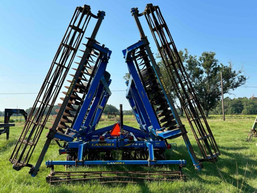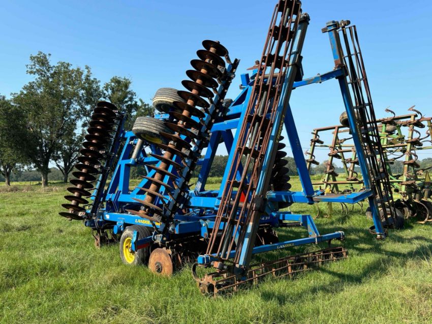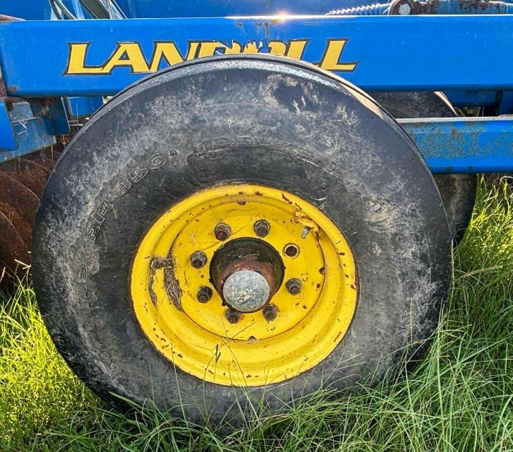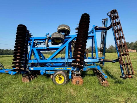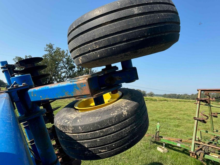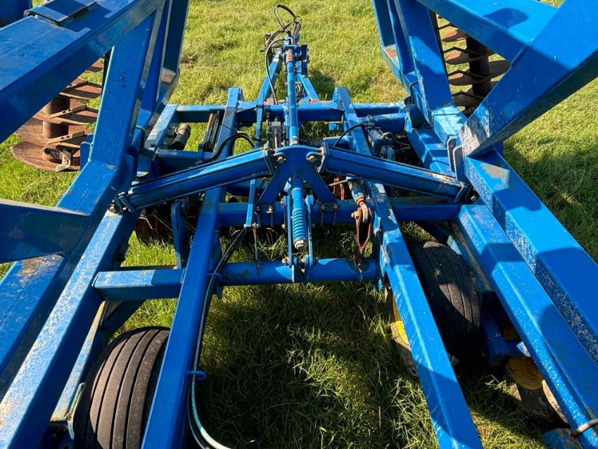 29' total width, 26'10" front gang width, 48 bladed front gang, 50 blade rear gang, 7" spacing with scrapers. Disc blades are 20" and 22" currently, Walking tandems, CAT IV hitch standard, Self leveling with hydraulic adjustment, Adjustable spring loaded down pressure (manual), Requires 240hp+.