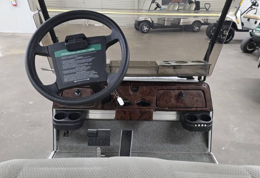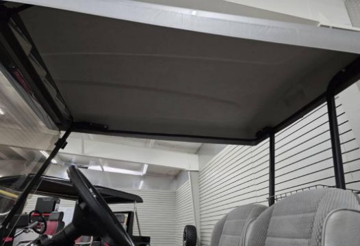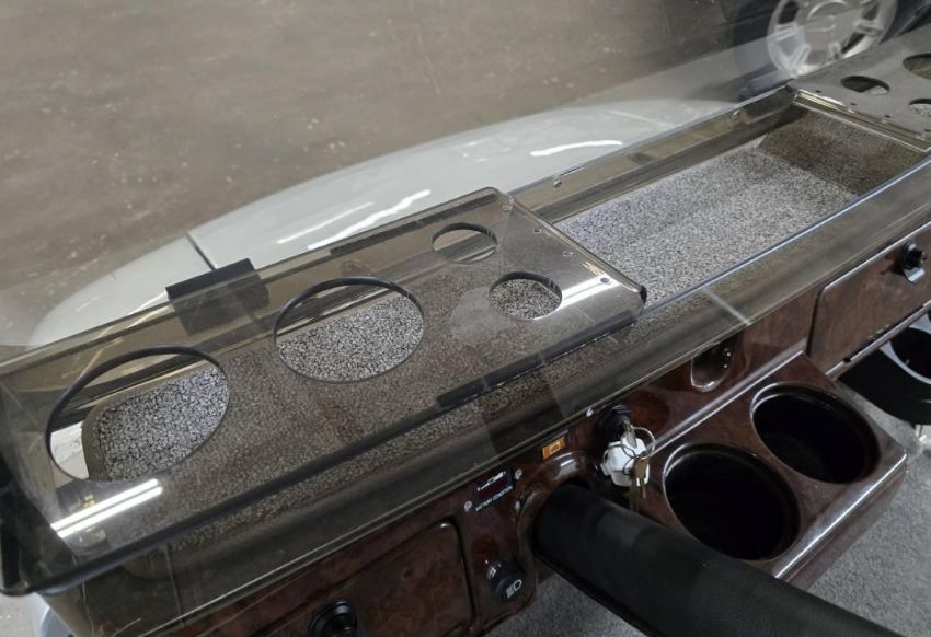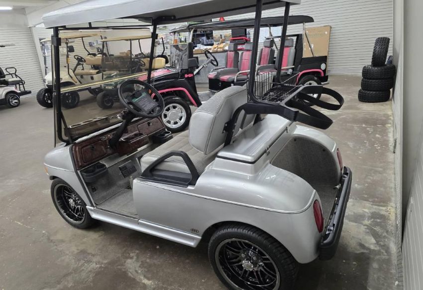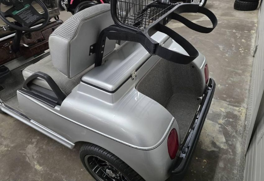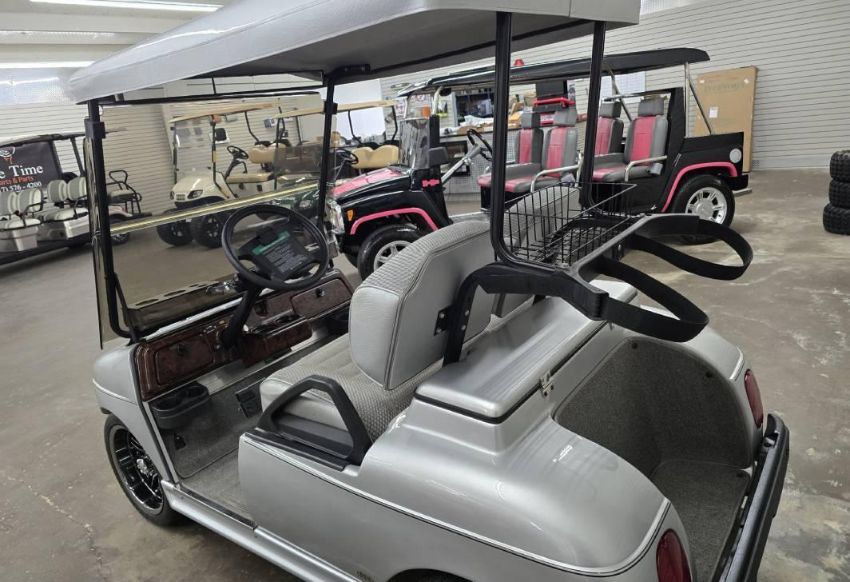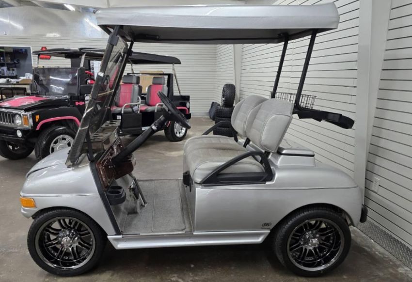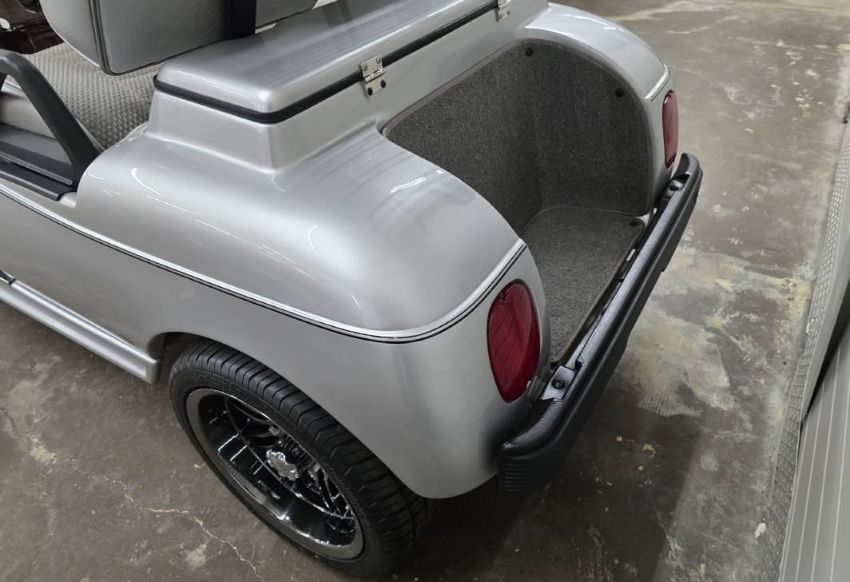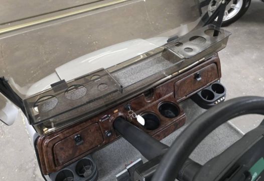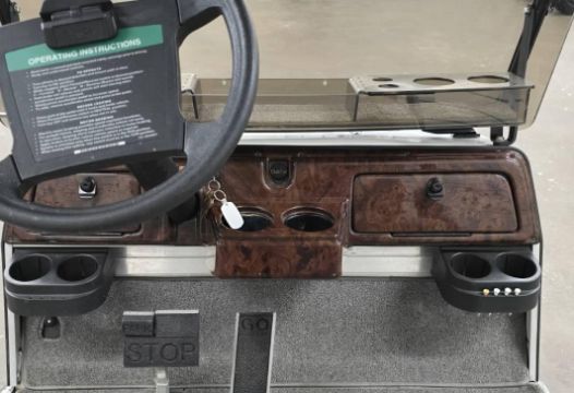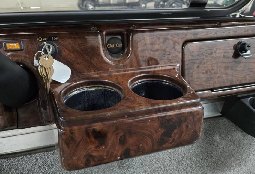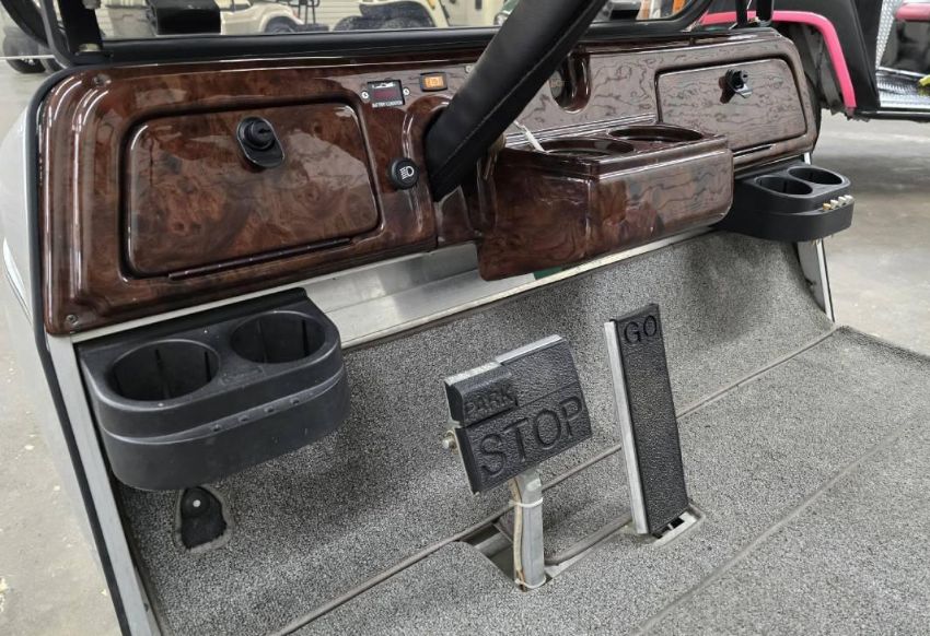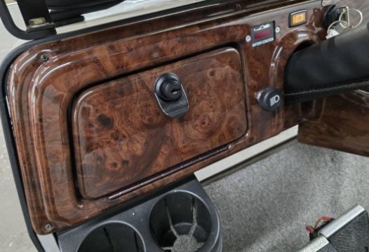 This custom 48V, 19MPH luxury golf cart features include: elegant wood grain dash and leather style upholstered roof, tinted windows, front locking storage compartment, body and body kit.