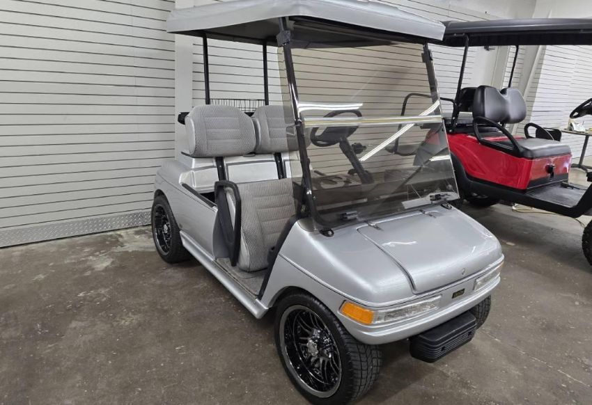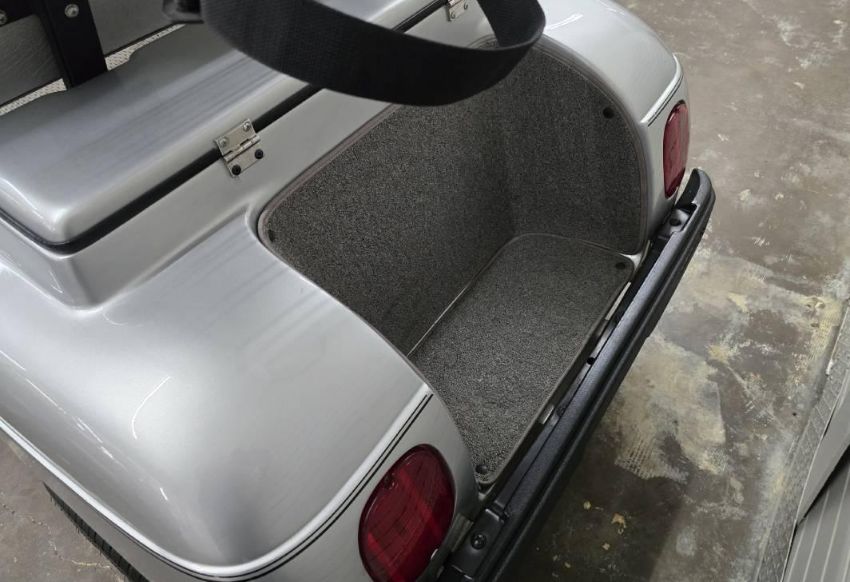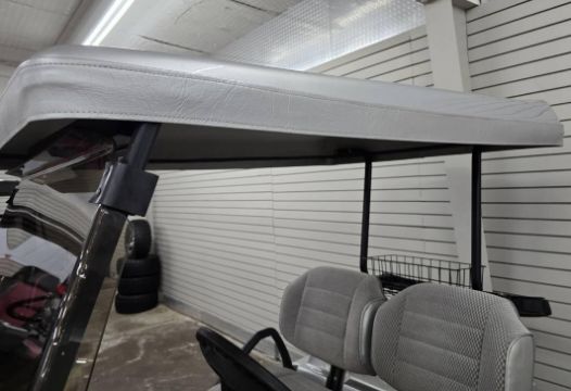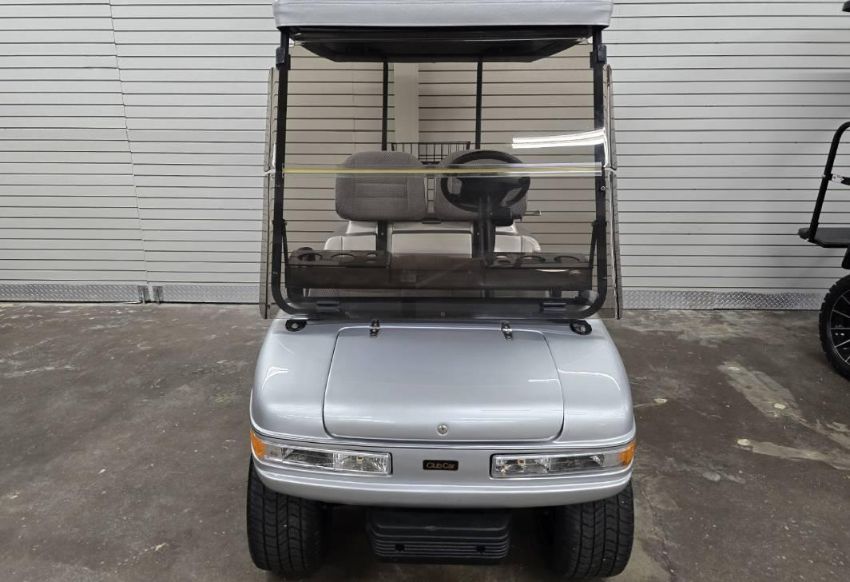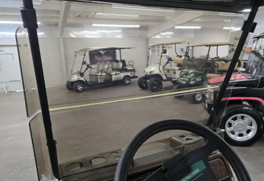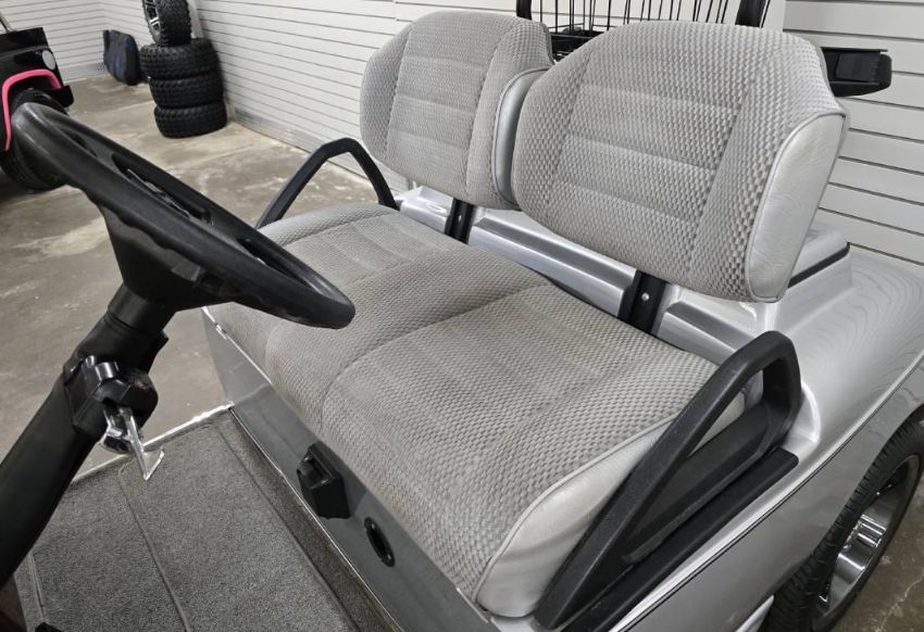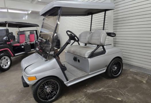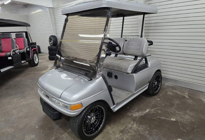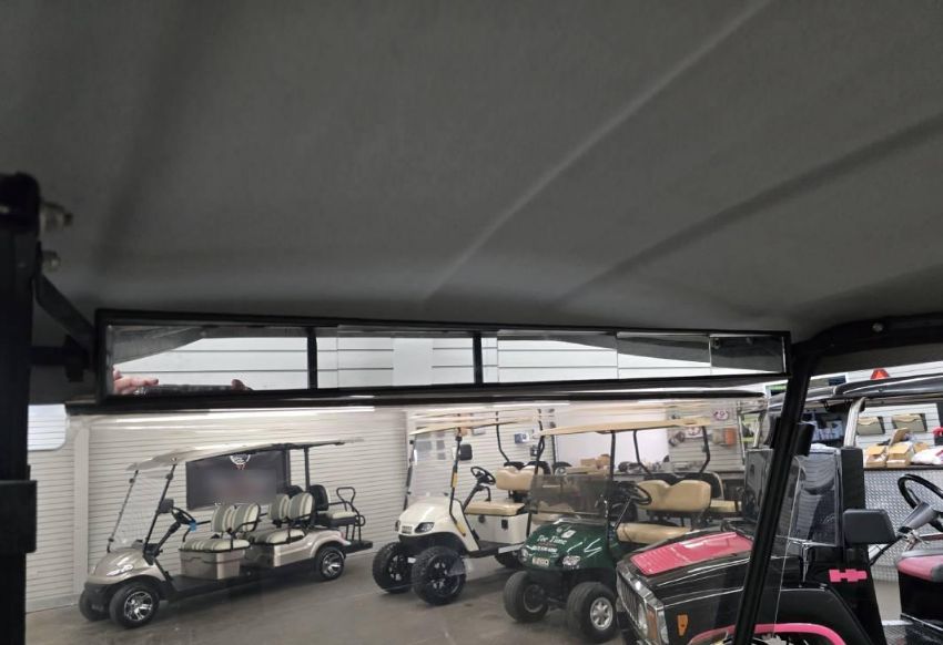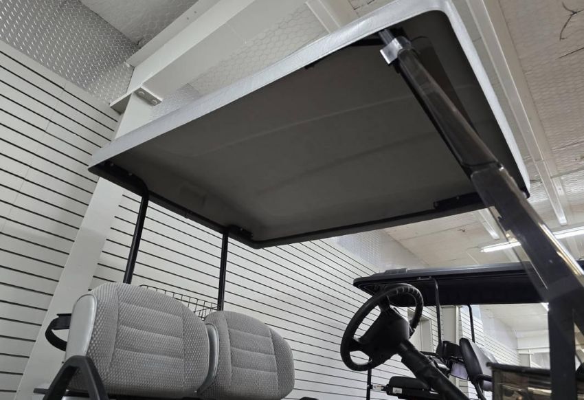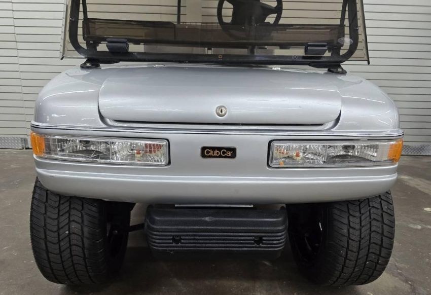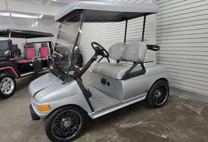 This custom 48V, 19MPH luxury golf cart features include: elegant wood grain dash and leather style upholstered roof, tinted windows, front locking storage compartment, body and body kit.