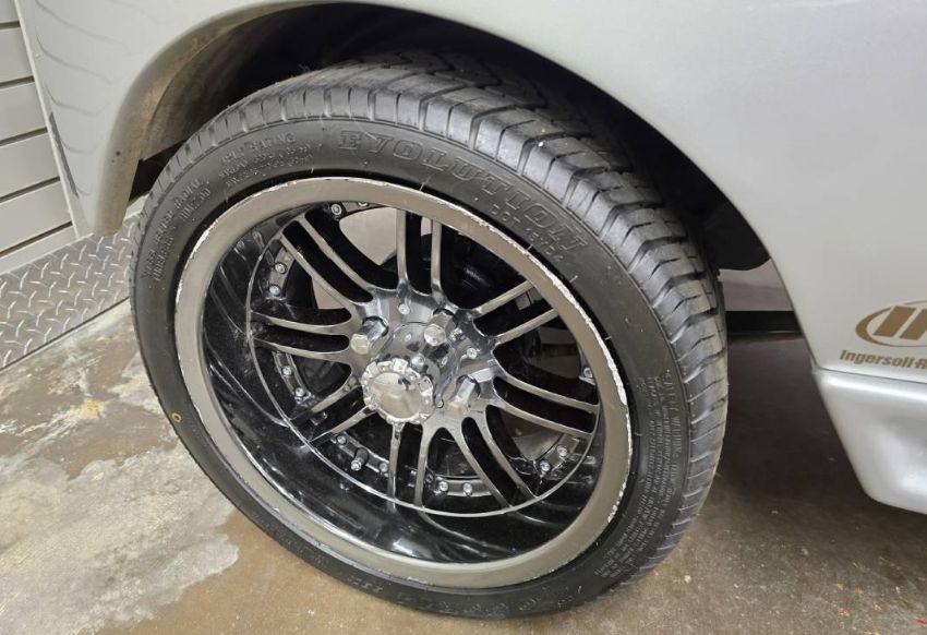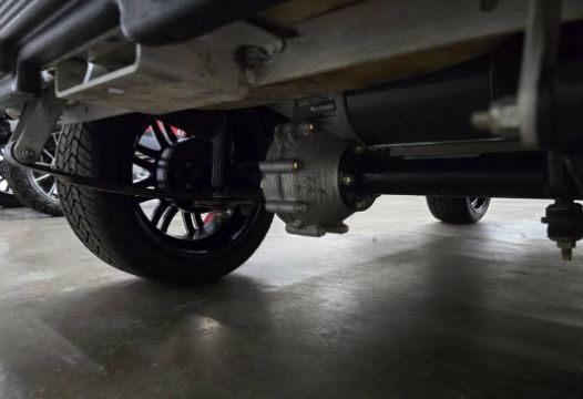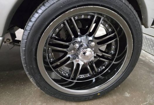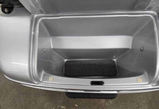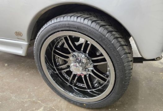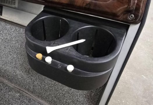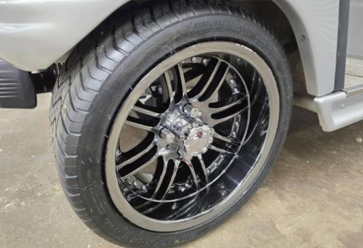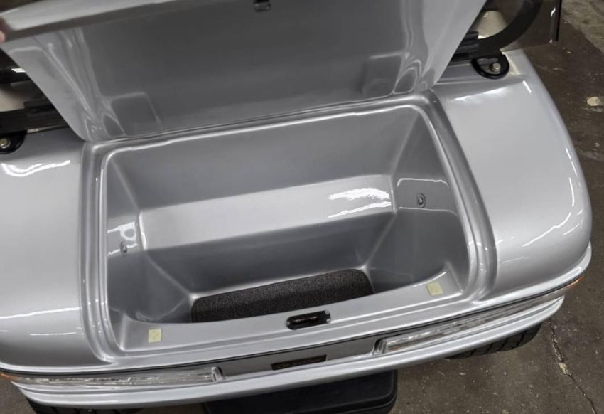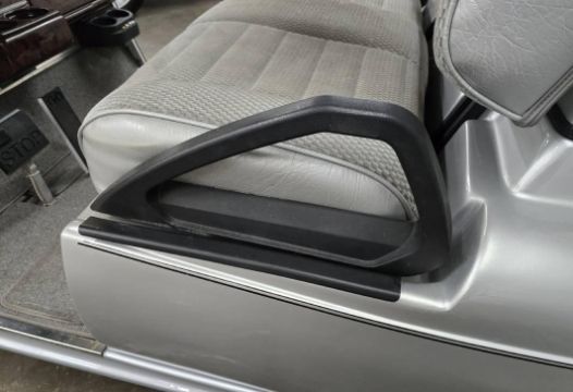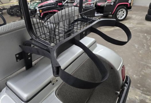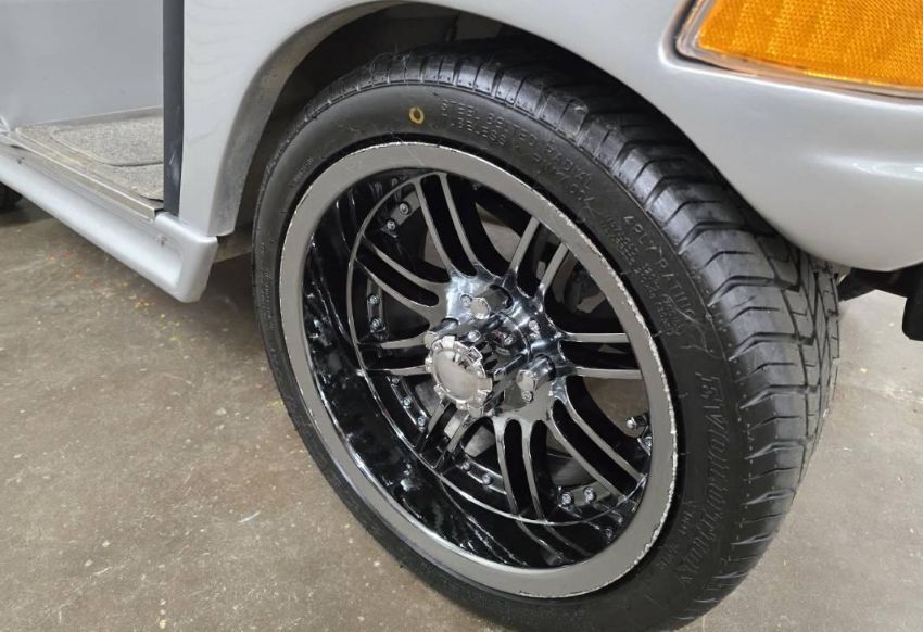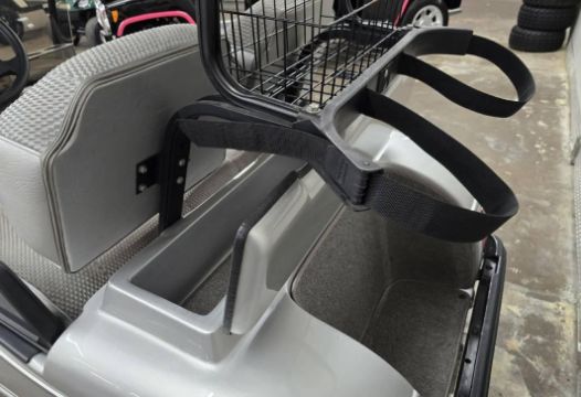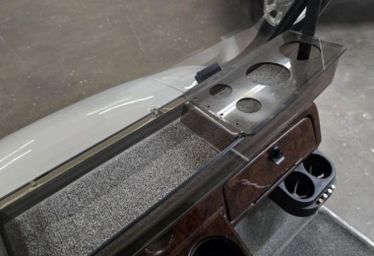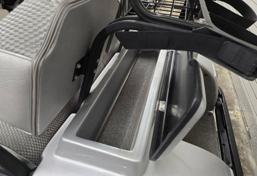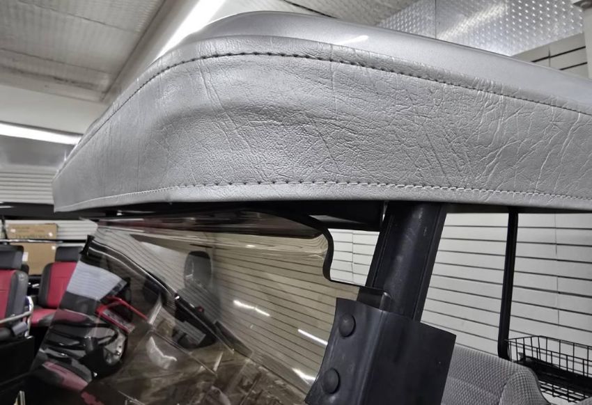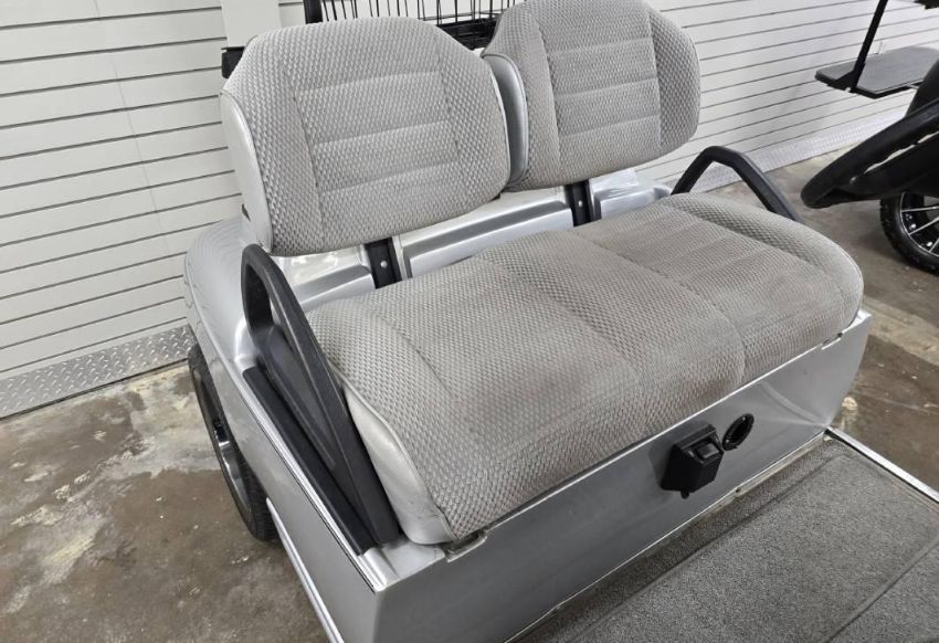 This custom 48V, 19MPH luxury golf cart features include: elegant wood grain dash and leather style upholstered roof, tinted windows, front locking storage compartment, body and body kit.