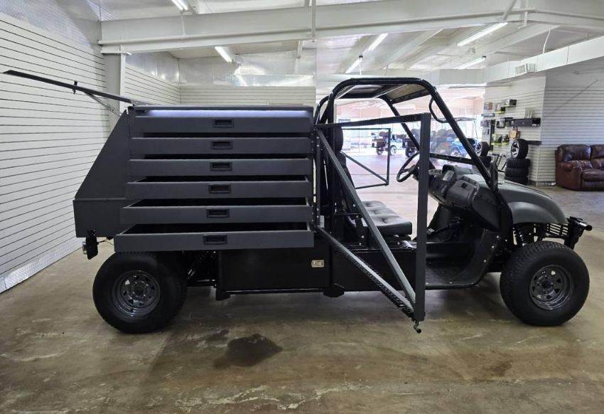 This 12MPH, 72V Utility Cart is PACKED with features including: Locking Tool Drawers and Larger Storage Compartments, a Rhino Lined Body and Roof, Brush Guard, Side View Mirror, LED Lit Work Station, 110 Outlets ON BOTH SIDES, Towing Hitch, Side Hitch Receiver, Shocks, and has NEVER BEEN OUT OF THE SHOWROOM!!! (New Old Stock)