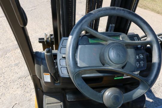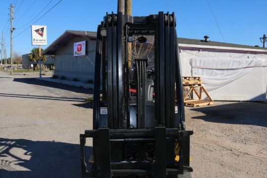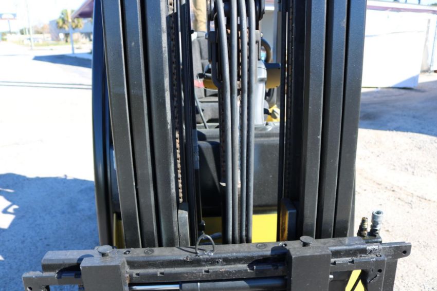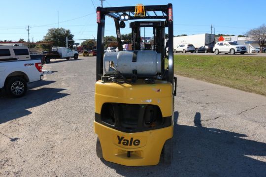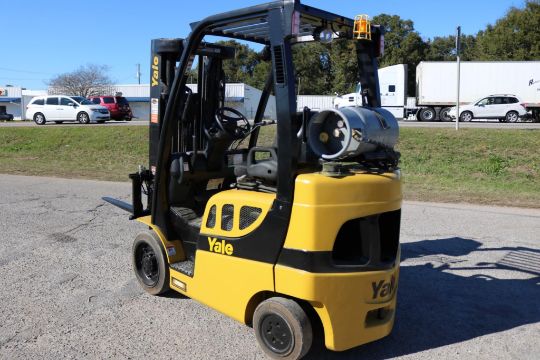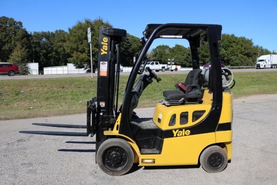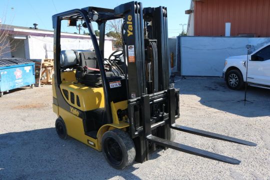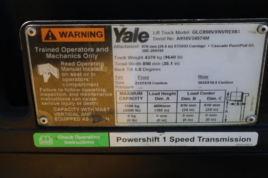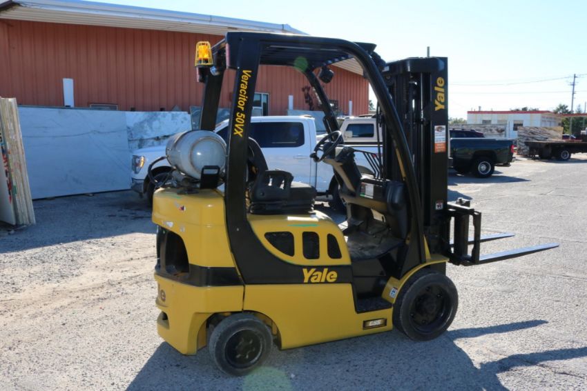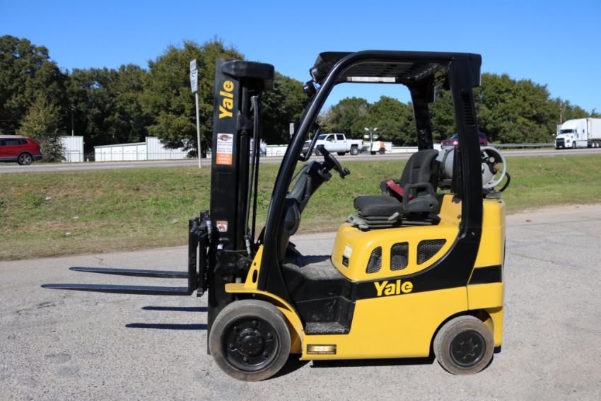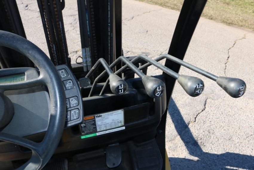 This 2017 Yale GLC050VX forklift is a reliable workhorse with a 3,500 lb lift capacity and LPG fuel system. Featuring a compact 40-inch width, 42-inch fork tines, and a powershift 1-speed transmission, this machine is built for efficiency in warehouse and material handling applications. It includes an auxiliary hydraulic connection on the mast for added versatility. Service light was on at the time of listing.