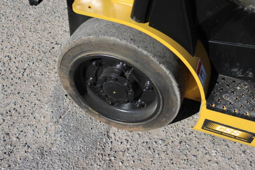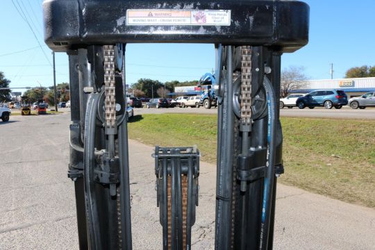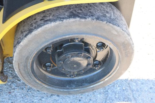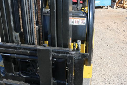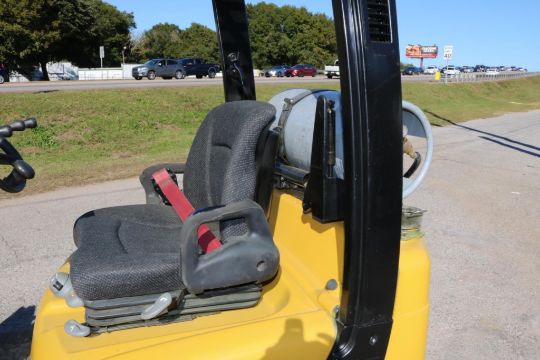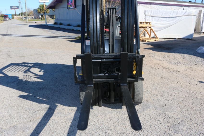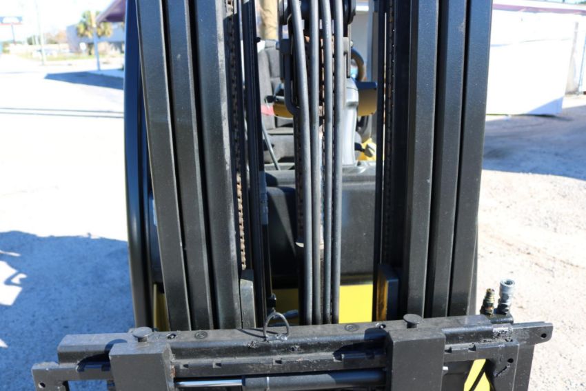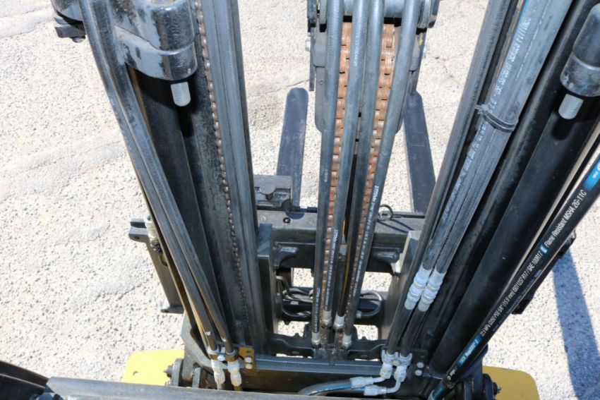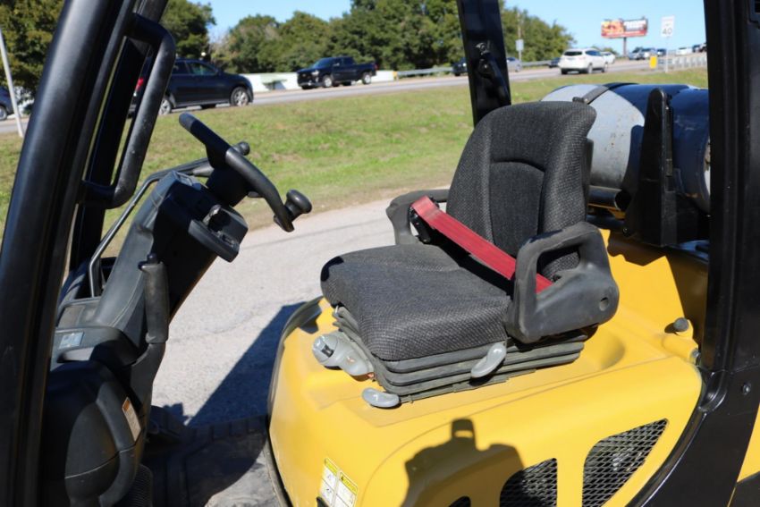 This 2017 Yale GLC050VX forklift is a reliable workhorse with a 3,500 lb lift capacity and LPG fuel system. Featuring a compact 40-inch width, 42-inch fork tines, and a powershift 1-speed transmission, this machine is built for efficiency in warehouse and material handling applications. It includes an auxiliary hydraulic connection on the mast for added versatility. Service light was on at the time of listing.