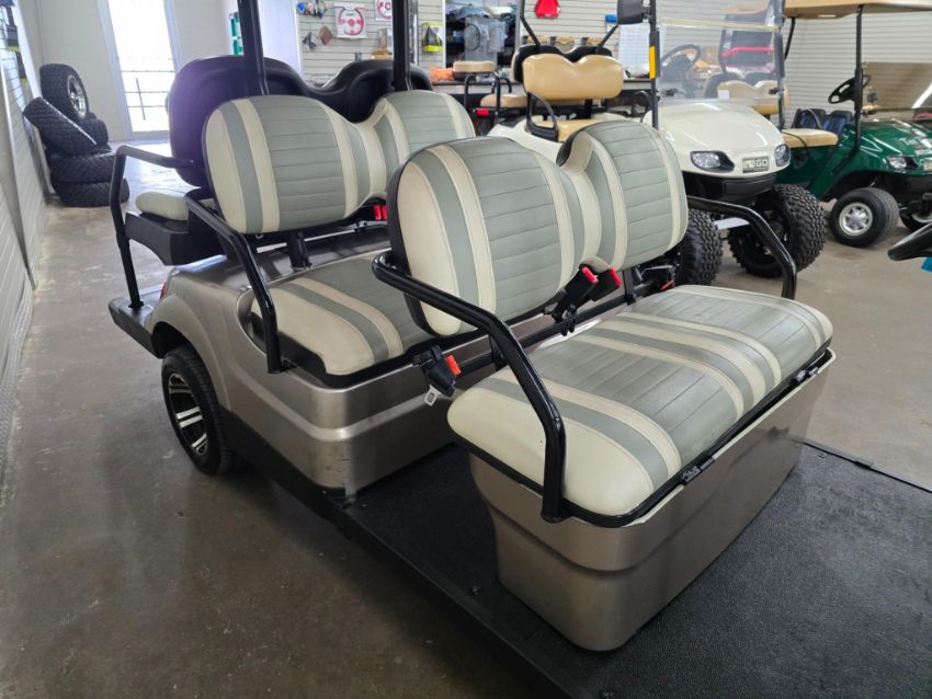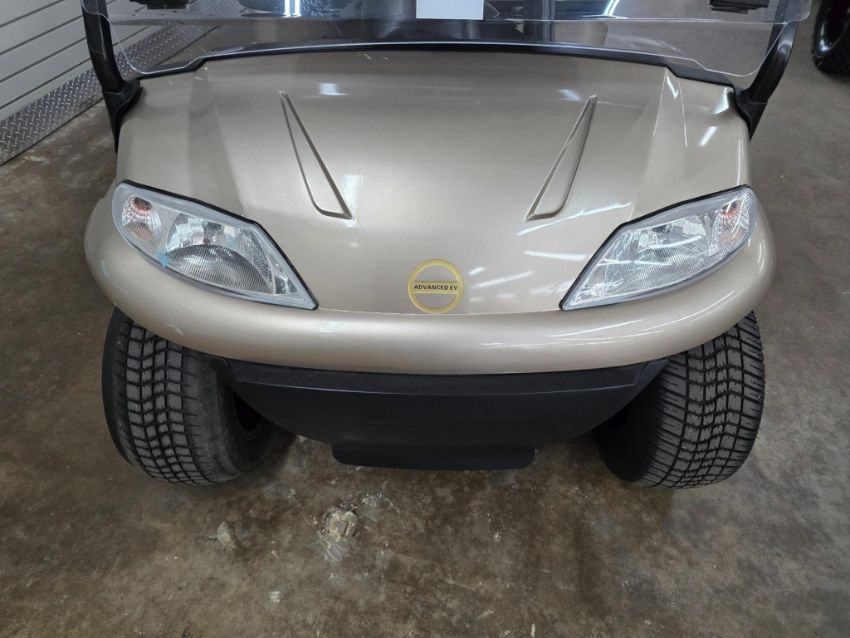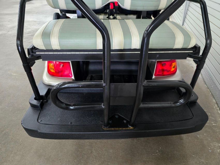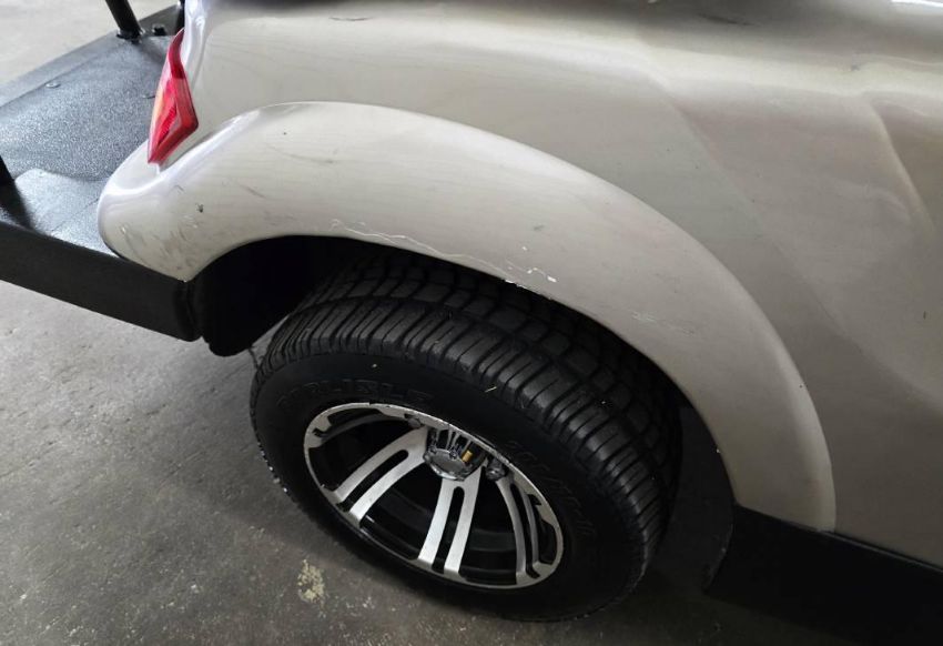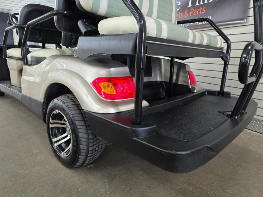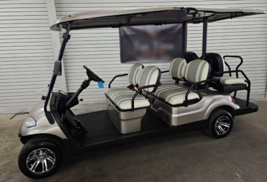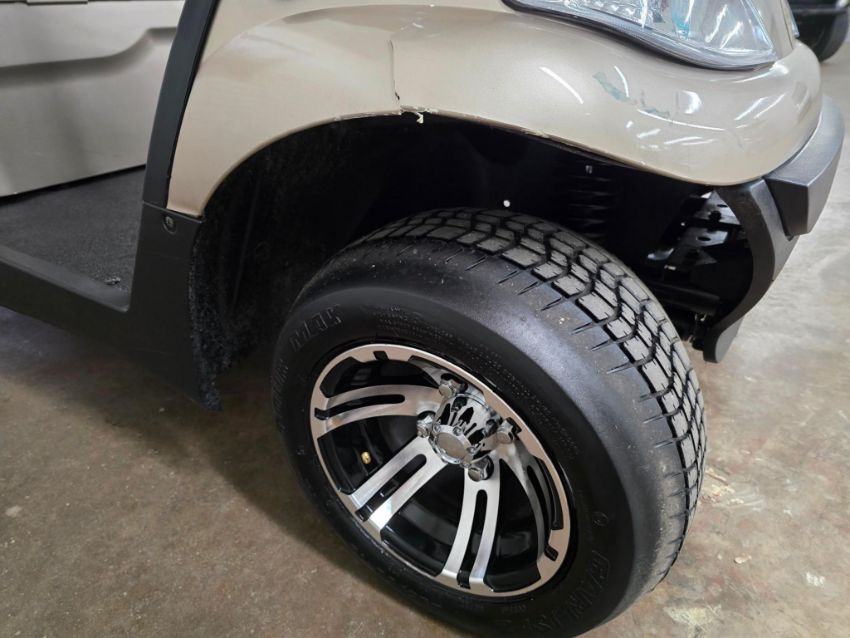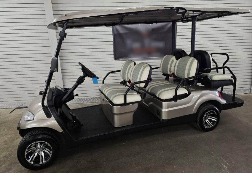 This 22MPH, 48V, 6-Passenger champagne colored golf cart has a number of safety features, including seat belts, a parking brake, and LED headlights and taillights. Please NOTE: Cart was driven into low clearance area leading to cosmetic damage on roof that does not in any way affect operation of vehicle.