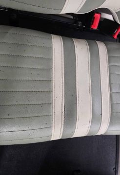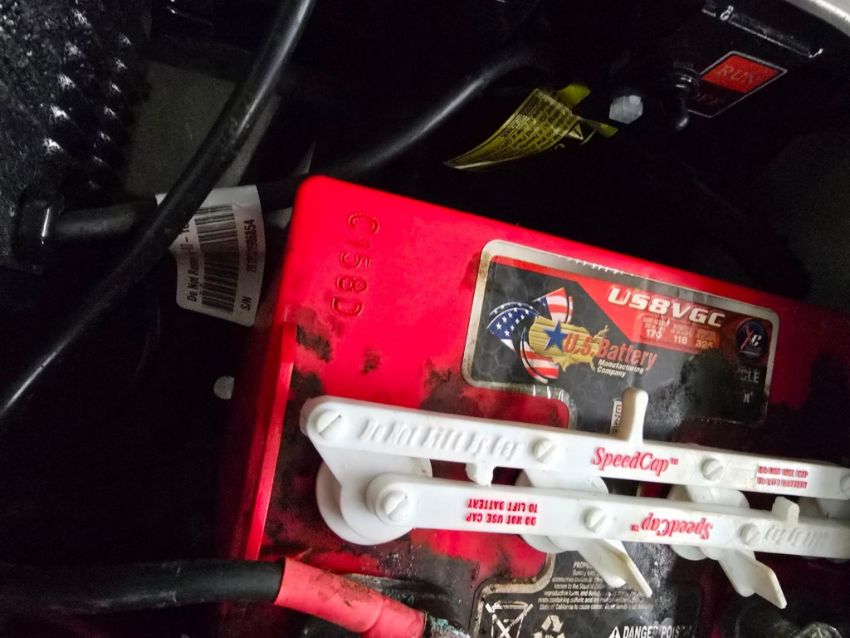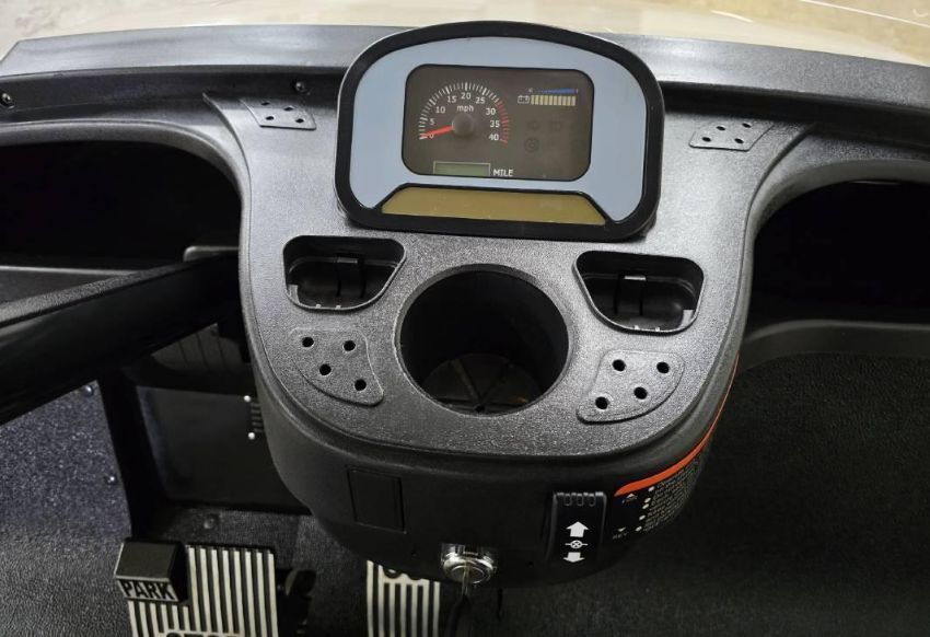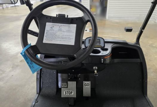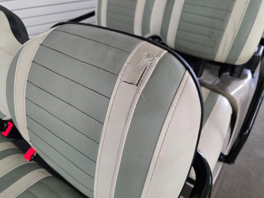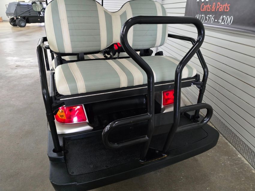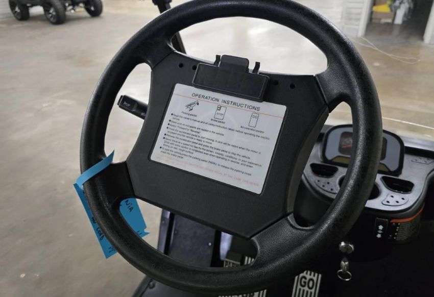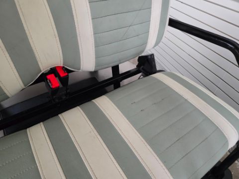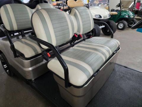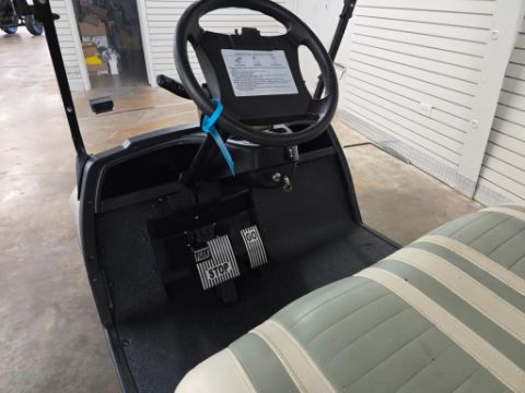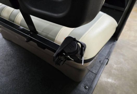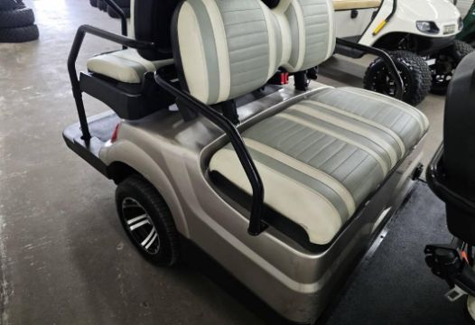 This 22MPH, 48V, 6-Passenger champagne colored golf cart has a number of safety features, including seat belts, a parking brake, and LED headlights and taillights. Please NOTE: Cart was driven into low clearance area leading to cosmetic damage on roof that does not in any way affect operation of vehicle.