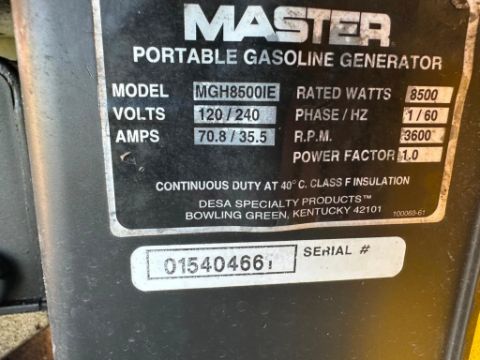Reliable and powerful, this Master MGH8500IE generator delivers 8,500 watts of power with an 18HP Honda engine. Featuring an electric start for easy operation, this unit provides 120/240V output, making it suitable for job sites, emergency backup, and farm use. Mounted on a pallet for easy transport.