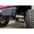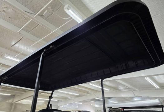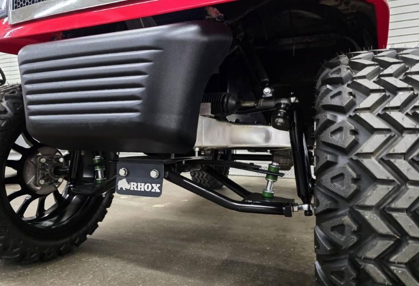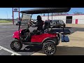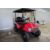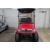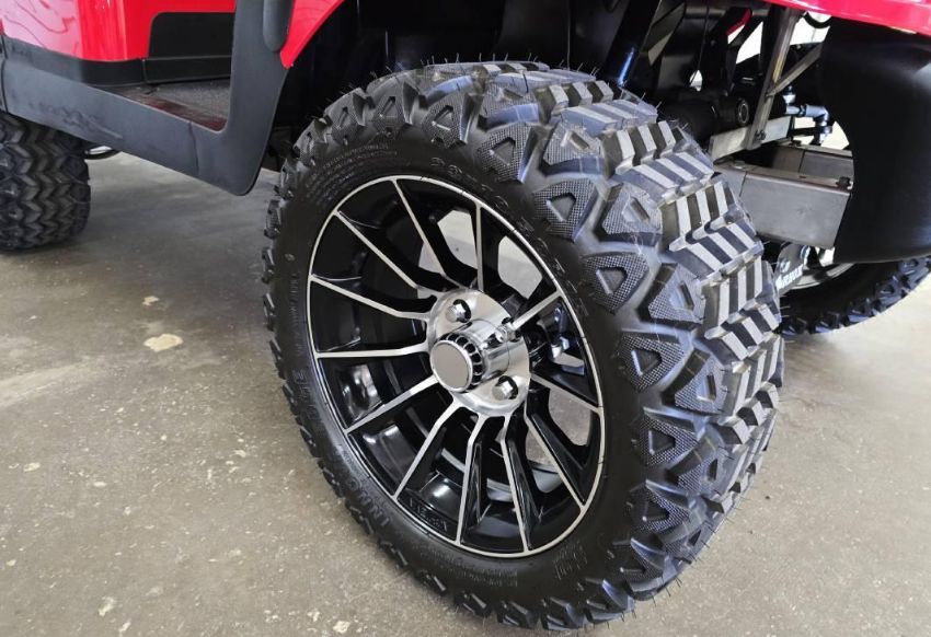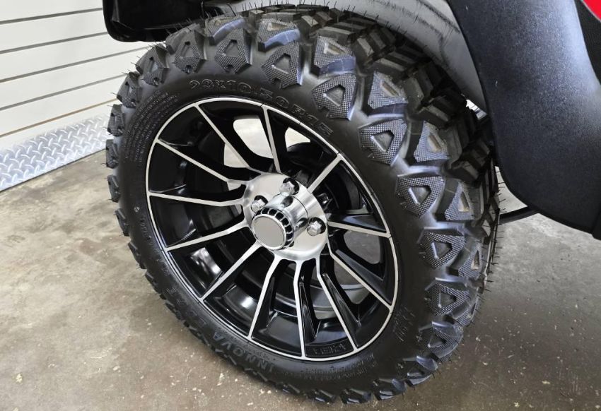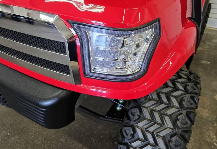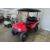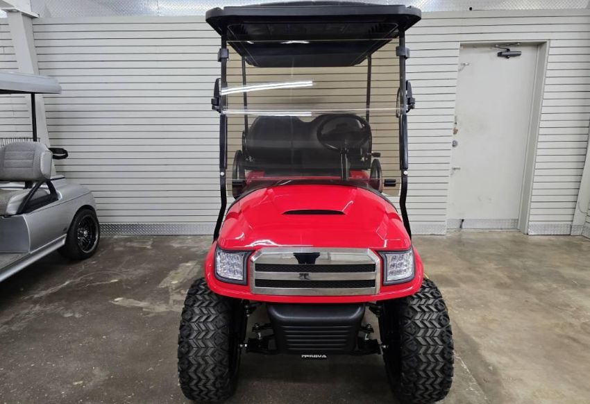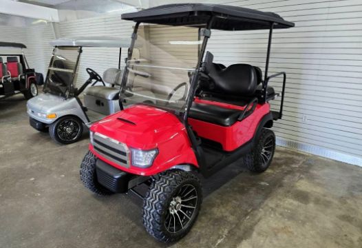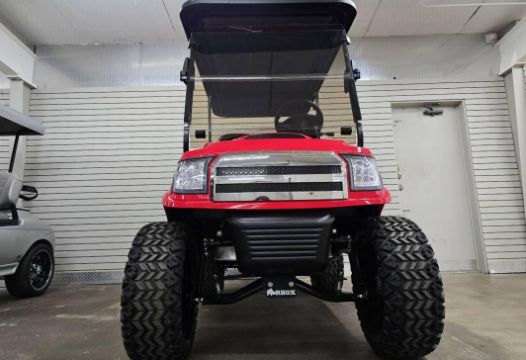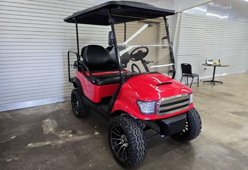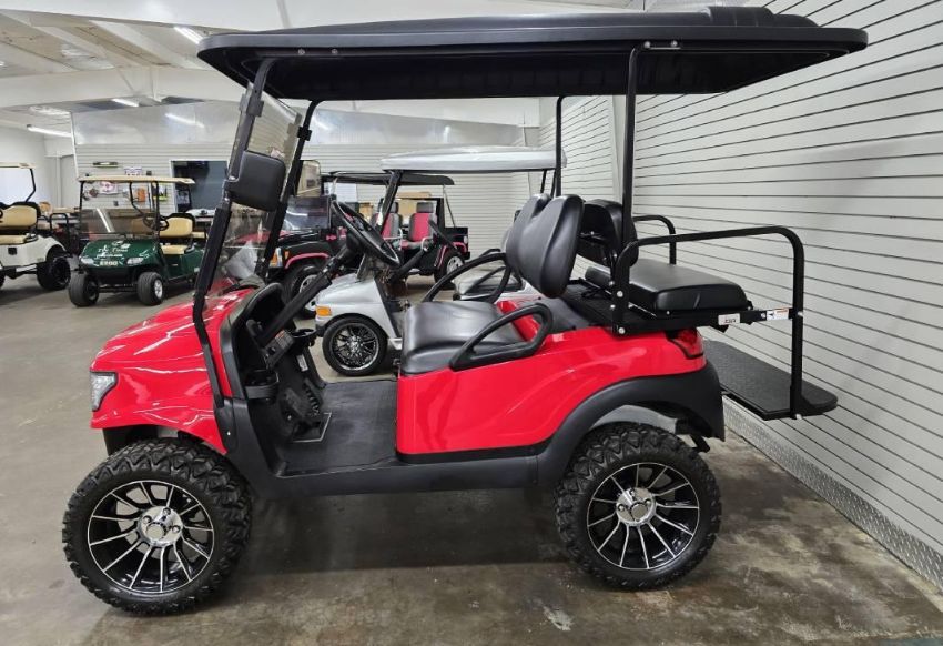 This 48V, 15MPH, fire engine red golf cart features a 6" body lift, all terrain tires, flip-over rear seat, custom wheels, tinted windshield, very low miles, and an extended roof that provides cover and shade for rear seat.