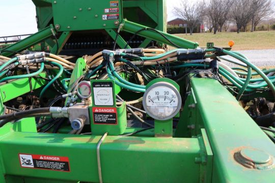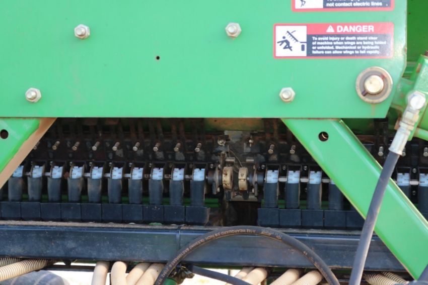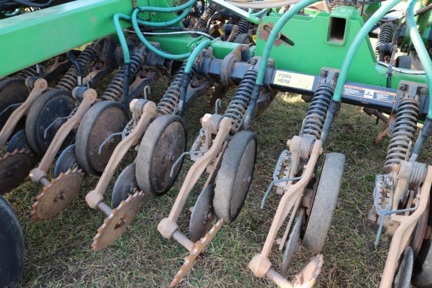 The 2000 John Deere 1860 is a 30ft wide seeding unit with a Gandy box for efficient seed distribution. It features wing fold functionality for easier transport and 7.5in spacing for precise seed placement. While the unit is in good condition, please note that some of the outside packer wheels are missing their rubber. This seeder is ideal for large-scale operations, offering reliable performance and durability for your seeding needs.