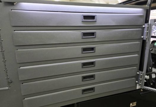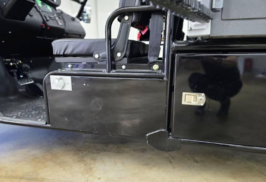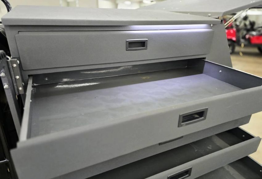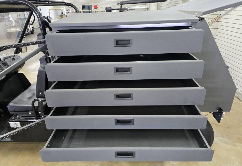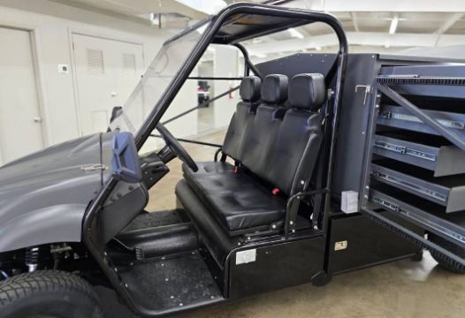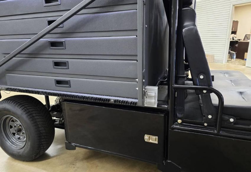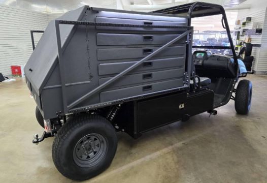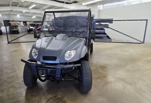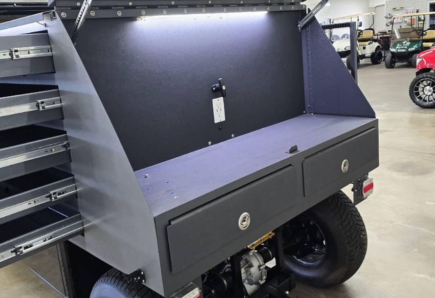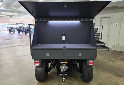 This 12MPH, 72V Utility Cart is PACKED with features including: Locking Tool Drawers and Larger Storage Compartments, a Rhino Lined Body and Roof, Brush Guard, Side View Mirror, LED Lit Work Station, 110 Outlets ON BOTH SIDES, Towing Hitch, Side Hitch Receiver, Shocks, and has NEVER BEEN OUT OF THE SHOWROOM!!! (New Old Stock)