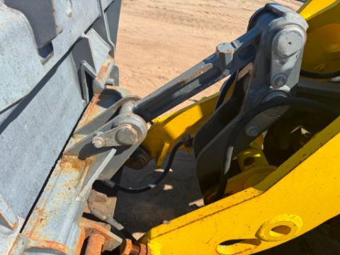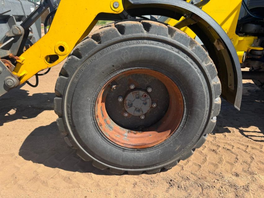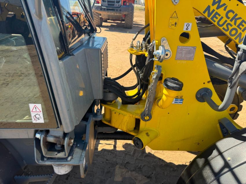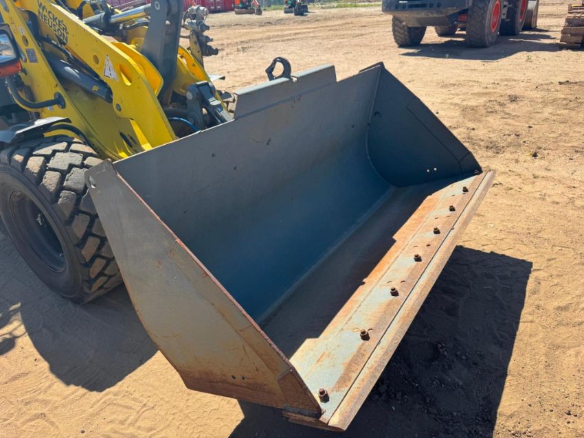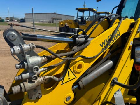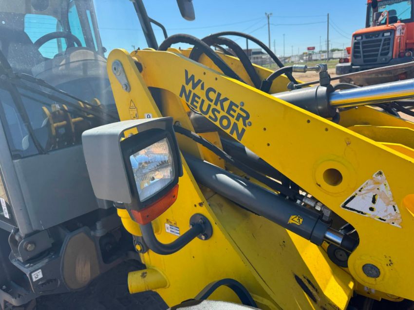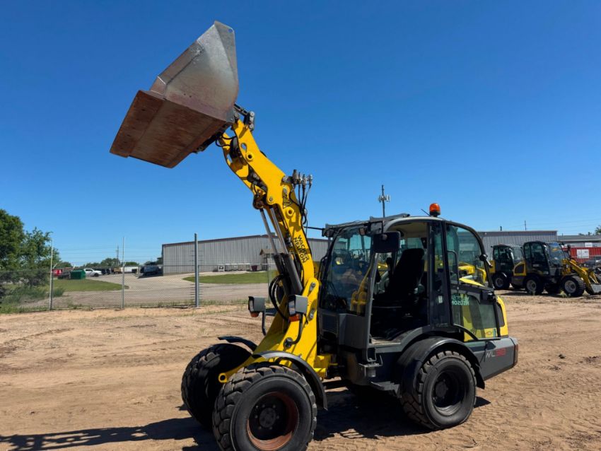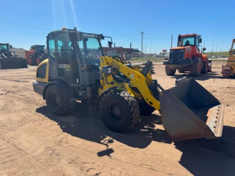 2018 Wacker Neuson WL38 compact wheel loader with 1,950 hours, powered by a 74 HP Perkins 804D-33T turbo diesel engine. This unit features hydrostatic all-wheel drive, articulated steering, Z-bar linkage, and a universal skid steer-style quick coupler with auxiliary hydraulics. The enclosed ROPS cab includes heat, and all functions operate smoothly. It offers a 3,748 lb rated operating capacity, 7,496 lb tipping load, and 10ft 8in lift height.