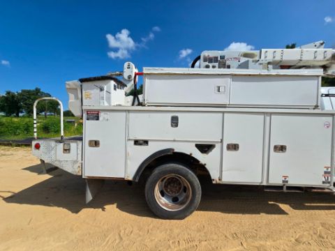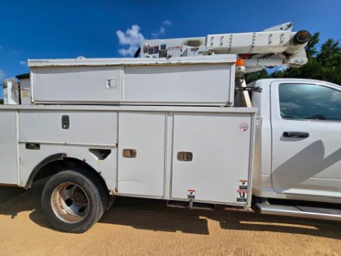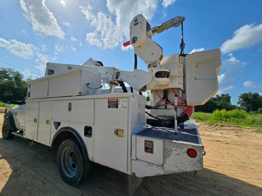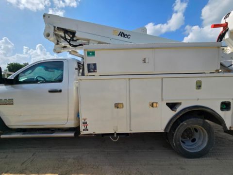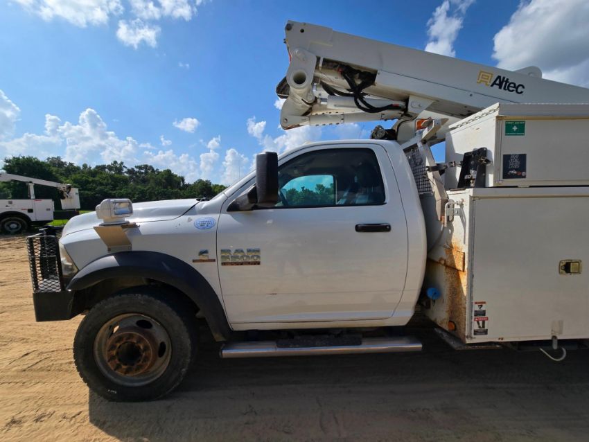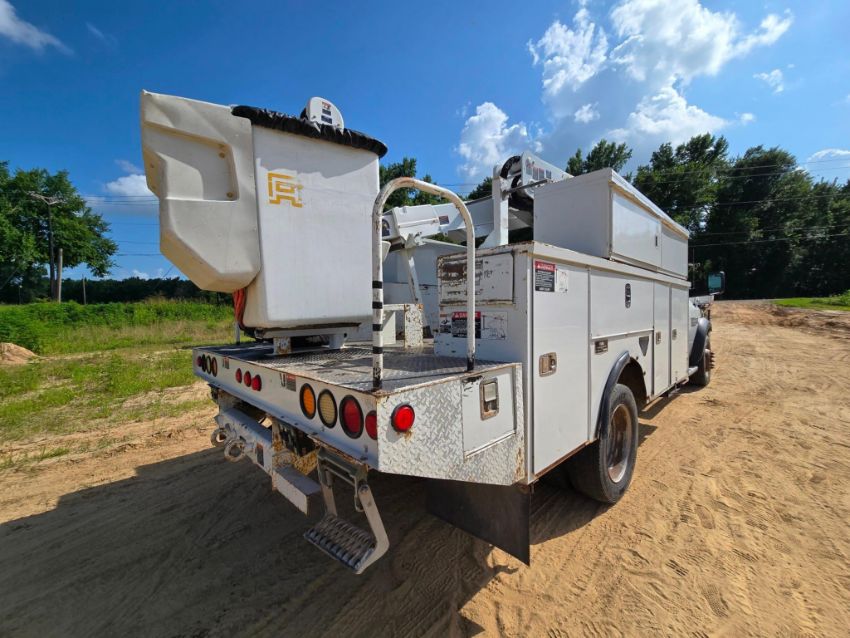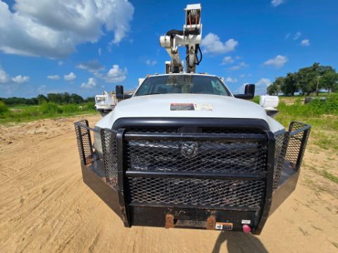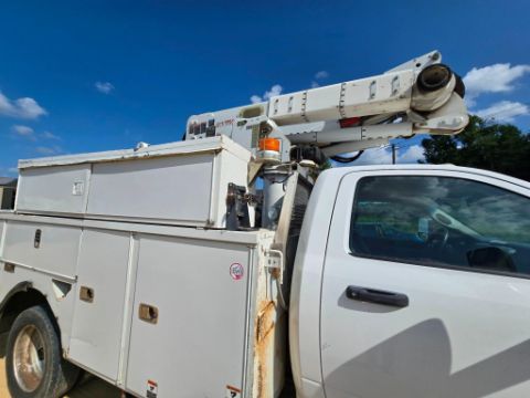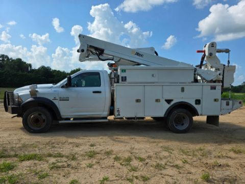 2014 Dodge Ram 5500 4x4 bucket truck with a Cummins diesel engine, automatic transmission, and 163,452 miles. Outfitted with an Altec AT40M boom offering a 45-foot working height, rotating bucket, and jib boom winch. Includes an 8-door utility bed - perfect for linework, utility service, and aerial access jobs. Built tough and ready to work.