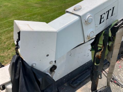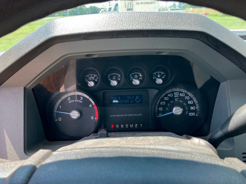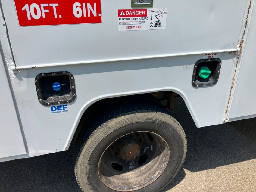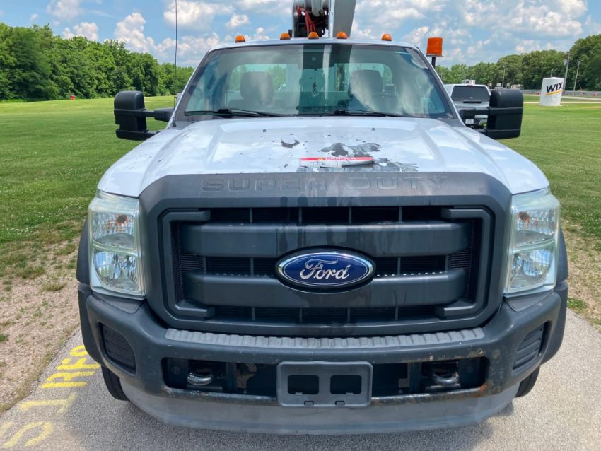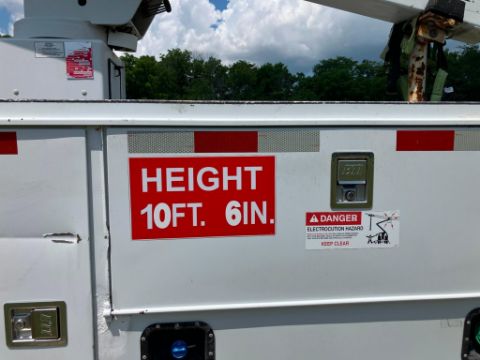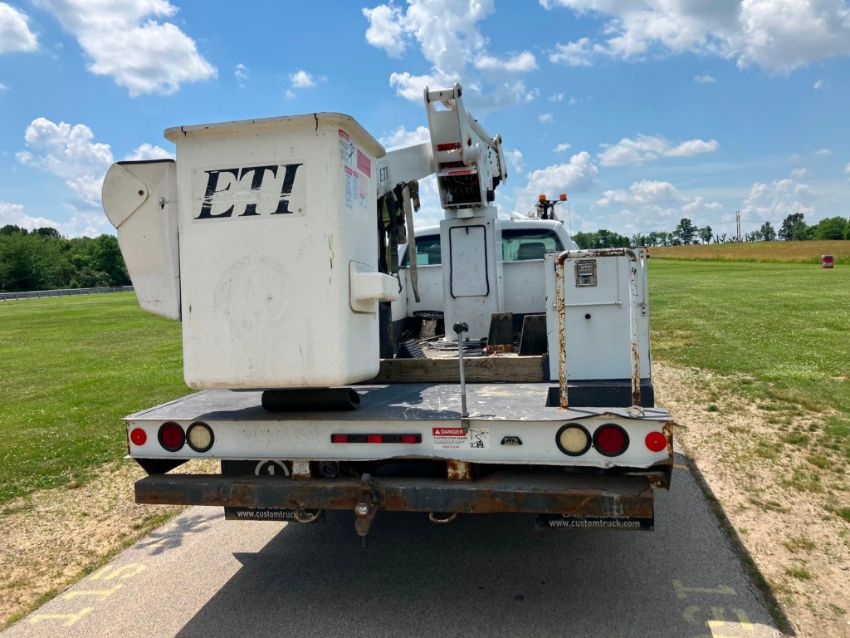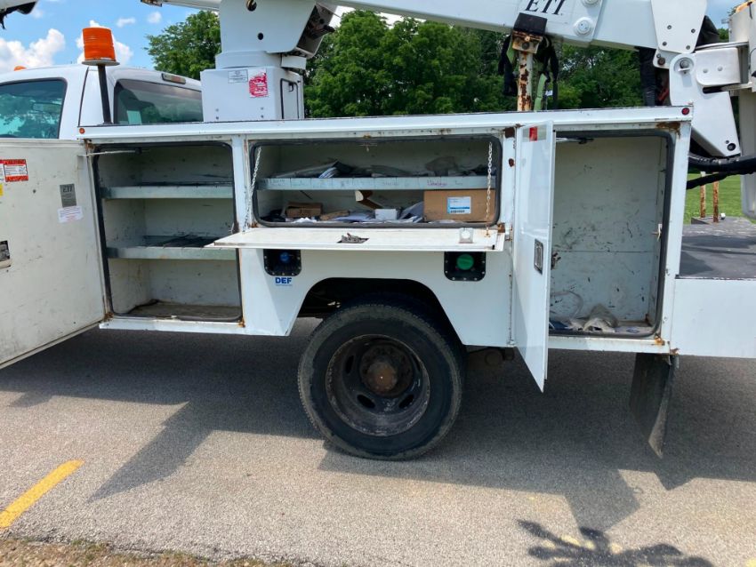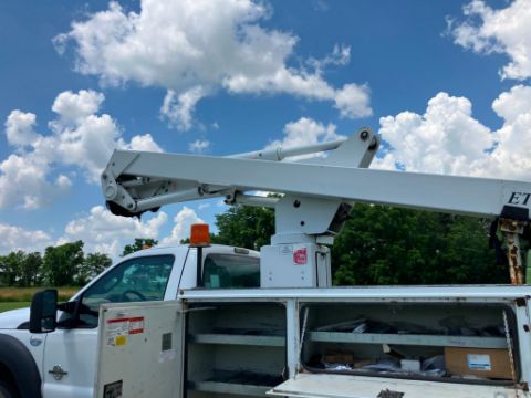 This F550 Bucket Truck has the Powerstroke Diesel, automatic transmission, and 2WD. It is equipped with a 6 door utility bed that includes a ETI37 Boom that has 42ft working height and a rotating bucket.