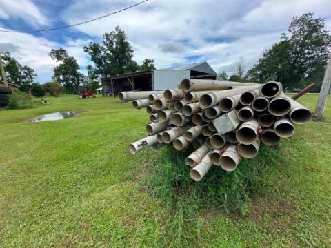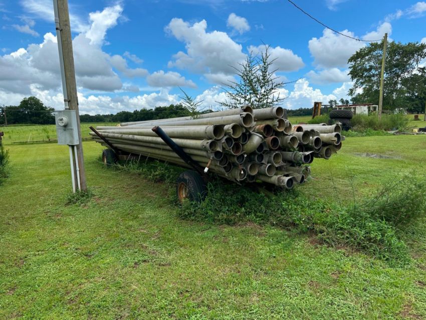 30ft sticks mix match irrigation pipe with trailer, trailer is in rough shape, tires are showing wire, latch lock pipe various diameter, buyer responsible for loading