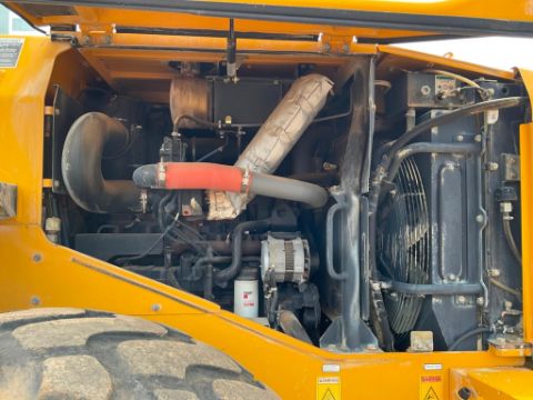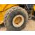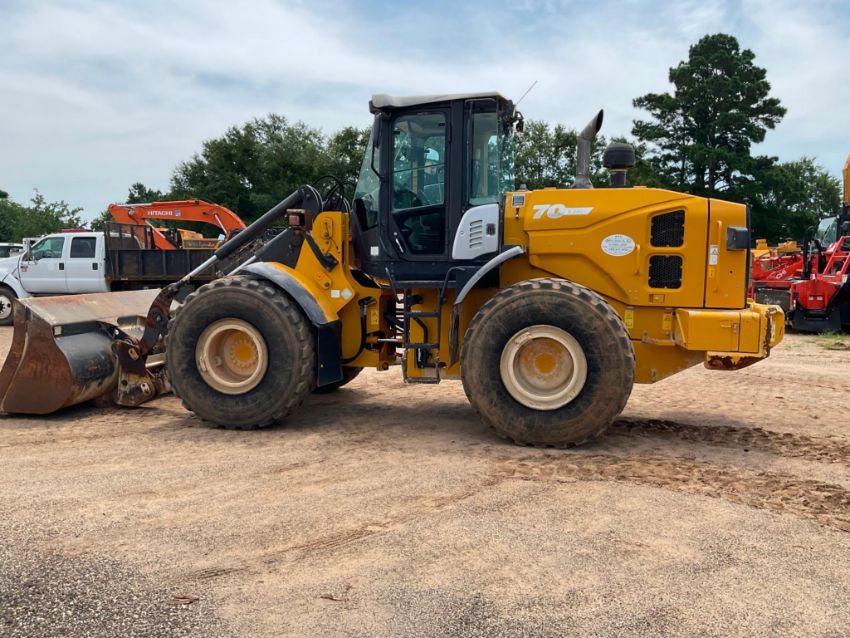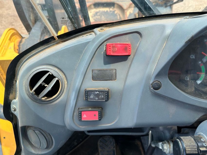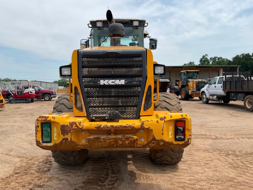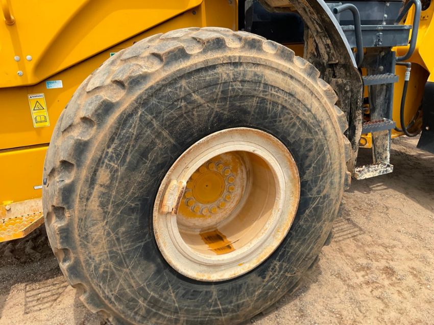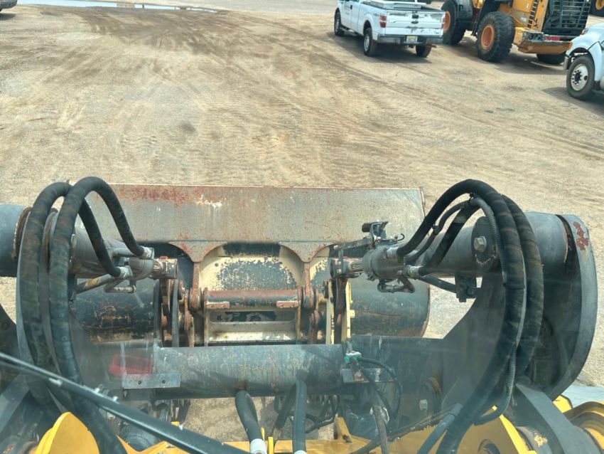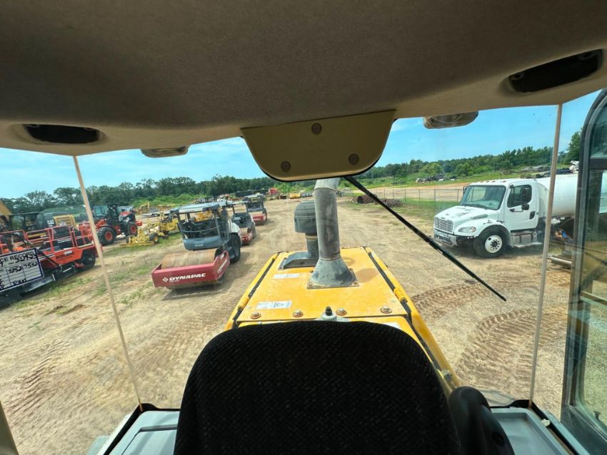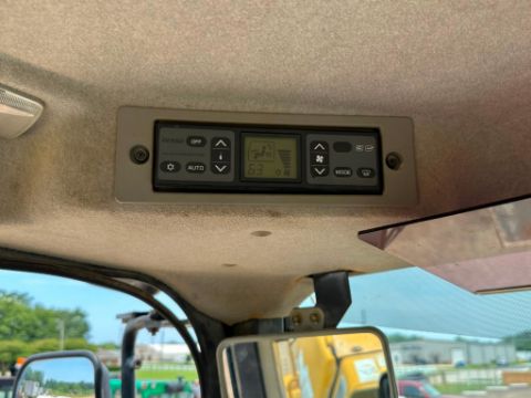 Kawasaki 70TM7 Articulating Wheel Loader equipped with a power quick attach and self-leveling front loader. This unit features an auto-on backup camera, cold-blowing A/C with a 64.4 degree reading, and an operational radio. The Michelin 23.5 R 25 tires appear to have approximately 50 - 60% tread remaining.