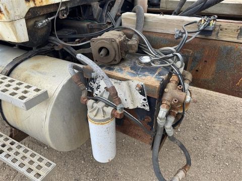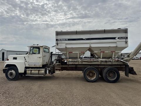 1985 Ford LTL9000 seed tender truck with 303,509 miles. Powered by a 400 Big Cam Cummins engine and equipped with a wet kit. Fitted with a Willmar Side Shooter 16 seed tender with auger.