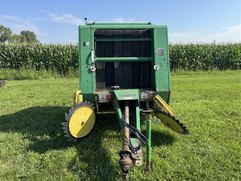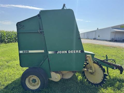 1990 John Deere 335 round baler capable of producing 4x4 bales. Twine-feed system, simple and reliable design suited for small to mid-size operations. Compact baler ideal for handling hay efficiently with lower horsepower tractors.
