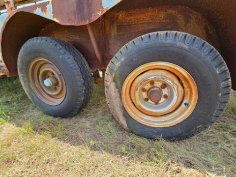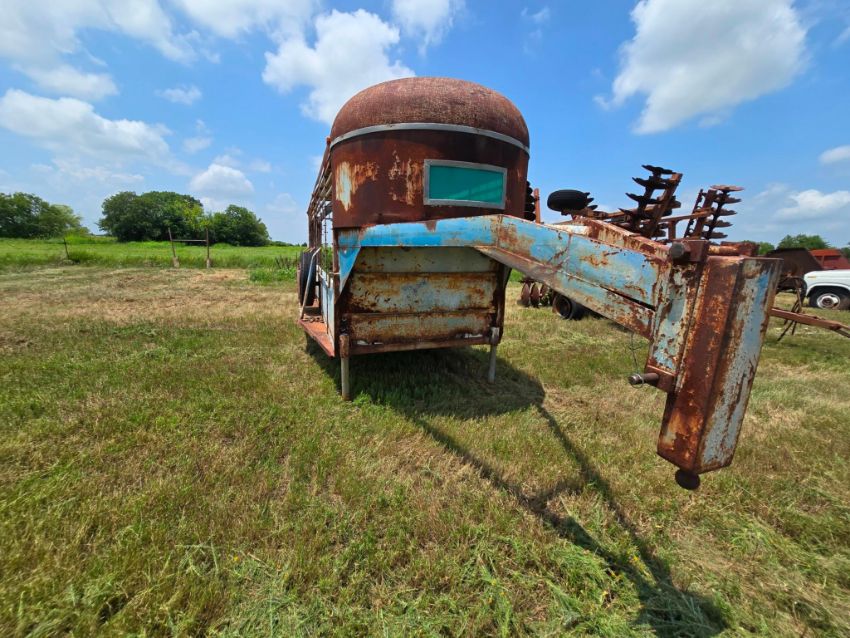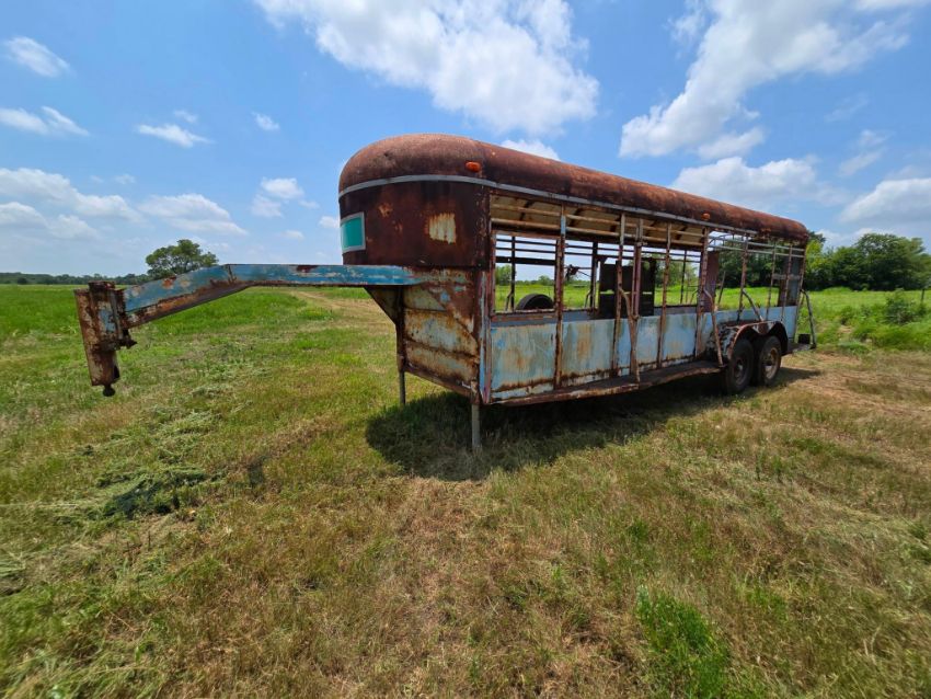 Selling absolute with no reserve! This vintage gooseneck livestock stock trailer is a solid foundation for your next ranch project or parts salvage. It features an open-air design, tandem axles, and a heavy-duty gooseneck hitch. Though weathered and in need of repair, the frame offers potential for restoration, custom fabrication, or repurposing as farm decor. Great for ranchers, welders, or collectors looking for a no-frills fixer-upper. Sells as-is to the highest bidder - don't miss this opportunity!