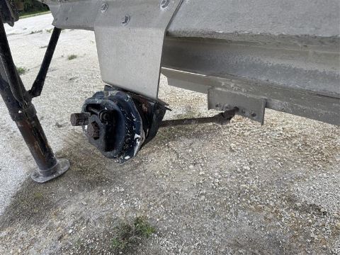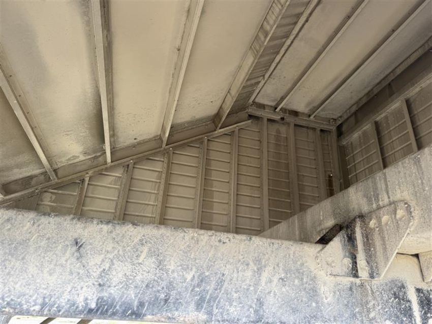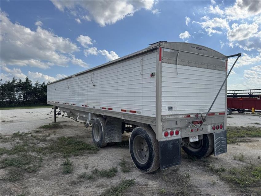 1996 Timpte 46-foot hopper bottom trailer with spread axles. Equipped with dual hopper traps, air ride suspension, and a SHUR-LOK manual tarp system. One side has new wheels and tires. A few lights are missing.