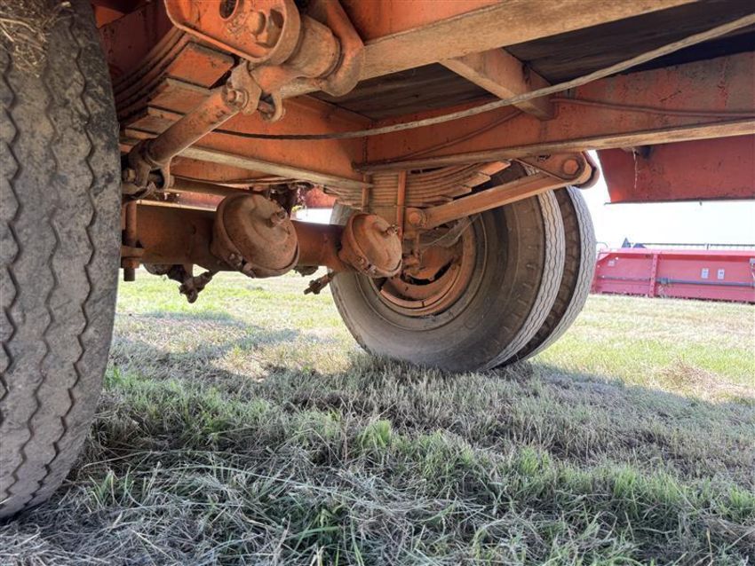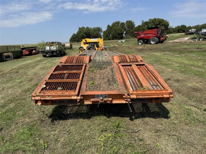 33ft Dovetail Flatbed Trailer. 32ft 10in total length, 8ft wide, 28ft flat deck, 4ft dovetail. Heavy duty built, pintle hitch. Ramps, Single axle. Unknown make/model.