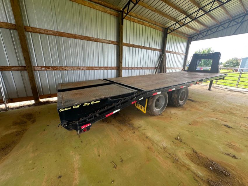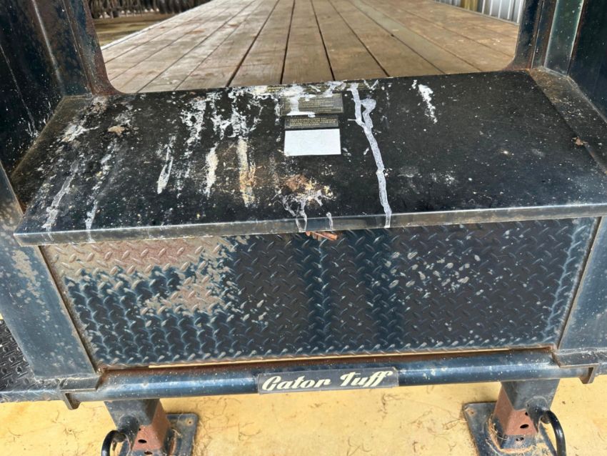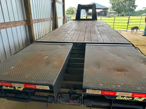 2018 Gatormade 20 plus 5 gooseneck trailer, 24.9K, treated decking boards, spare tire, front locking tool box, Hercules 235-80R16 steel belted 114 ply tires less than 18 months old, spring assist wide ramps, tie down rail with 5 tie down straps.