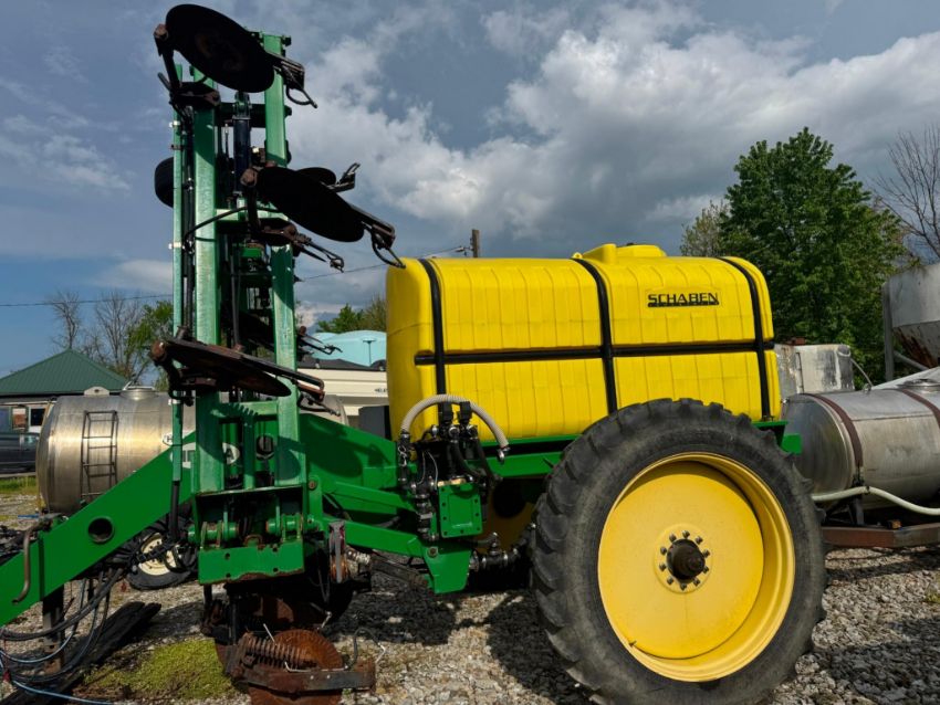 35-ft toolbar, 12-row configuration. 1,500-gallon poly tank. Ground drive pump system. Coulter injection units with adjustable row spacing. Heavy-duty 7inx7in toolbar frame. Tandem walking axle, 380/90R46 tires. Category 3 hitch. Hydraulic folding wings. Clean, ready-to-use unit for liquid side-dress application.