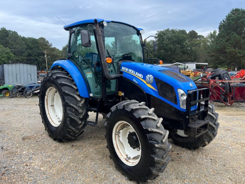 2015 New Holland T4.95 MFWD Cab Tractor. 12x12 Power shuttle transmission - four synchronized gear in 3 ranges with left hand power shuttle, 540 PTO, 2 set rear SCV remotes, 16.9 gpm hydraulic pump, MFWD with E/H engagement, air seat, deluxe cab, front grill guard. Tractor has minor cosmetic points (seat torn, light busted, mirror broken) but is solid and mechanically sound.