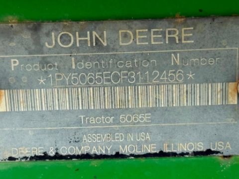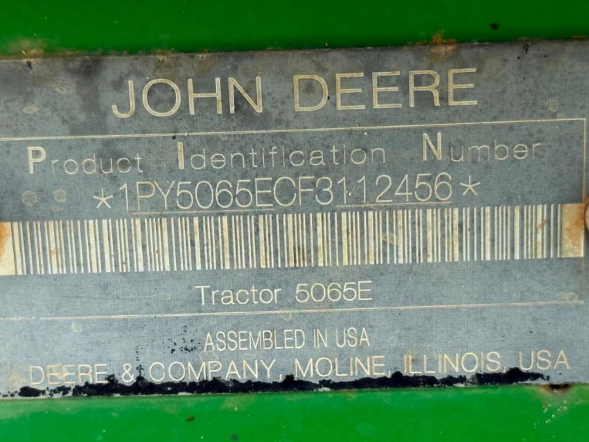 John Deere 5065E 2WD tractor showing 1,496 hours. Equipped with a metal canopy, front weights, one set of rear remotes, mechanical suspension seat, drawbar, and 3-point hitch. Tractor is operational and all fluid levels were within normal range at the time of inspection. Seat has tears, shift lever caps are faded, and the plastic grip on the 3-point control lever is missing.