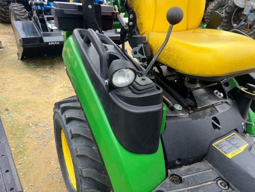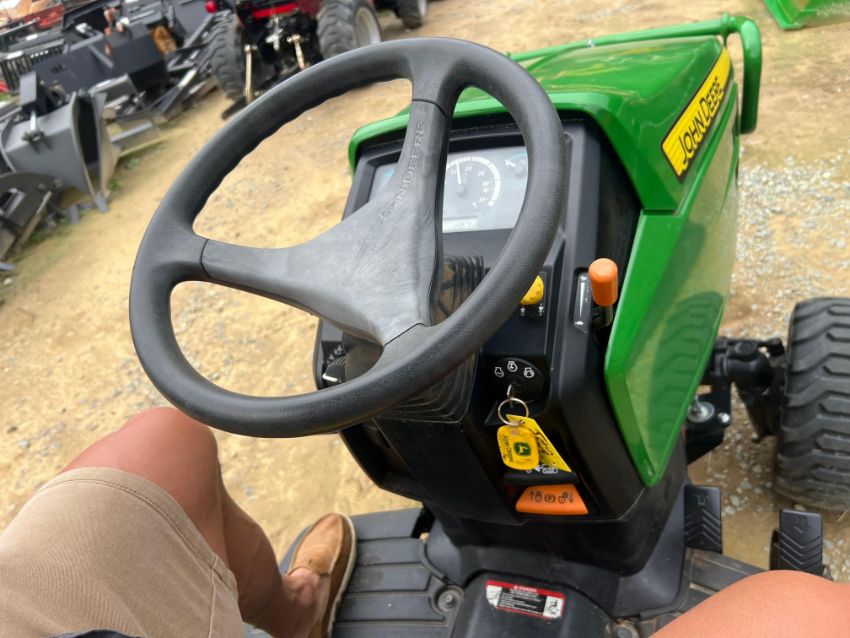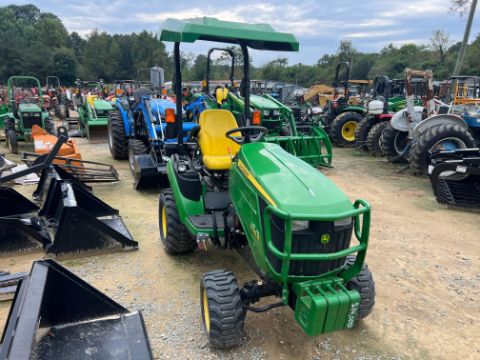 2020 John Deere 1025R MFWD Compact Tractor with deluxe canopy and rear 3pt iMatch quick hitch. With only 107 hours this unit is in excellent condition. 540PTO, rear toolbox, quick hitch, mower deck height adjustment, front working light package, deluxe canopy, joystick and mid mount package, grill guard, 4 front weights. Easily add a front end loader and mid mount mower deck to this unit and you could have the ultimate homeowners asset.