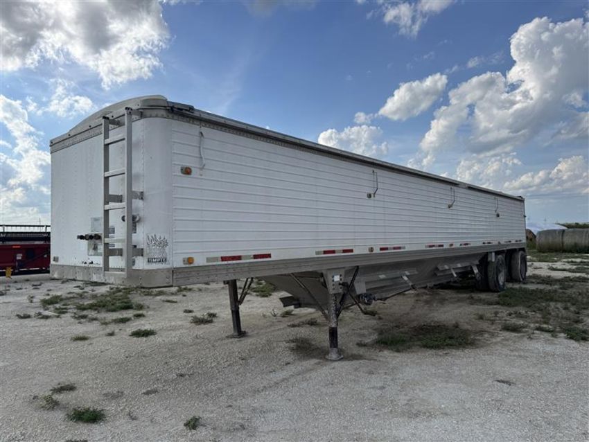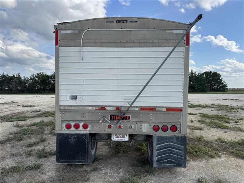 1996 Timpte 46-foot hopper bottom trailer with spread axles. Equipped with dual hopper traps, air ride suspension, and a SHUR-LOK manual tarp system. One side has new wheels and tires. A few lights are missing.