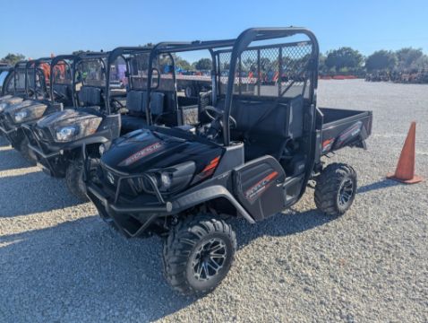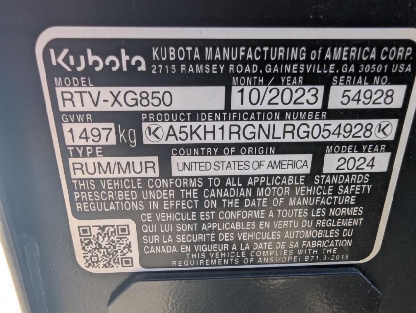 New 2023 Kubota RTVXG850SLAS24 UTILITY VEHICLE, SN 54928 WITH 5 HOURS. Open ROPS. UV Spec Gas Engine. 54HP. ATV Alloy Wheels. Bed Liner. The Kubota RTV-XG850 Sidekick features a 48.3 horsepower, 851cc DOHC engine, a CVT transmission, and a 2,000 lb towing capacity. Its dimensions are 119.6 inches long, 63.2 inches wide, and 79.5 inches tall (including the ROPS). Key specs also include a 1,000 lb bed payload capacity, independent front and rear suspension, and selectable 4WD.