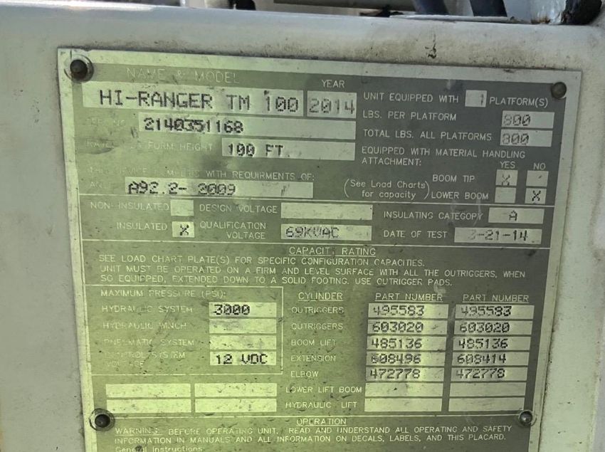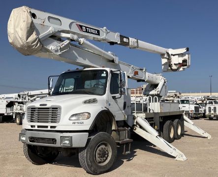 2015 Freightliner Bucket Truck: Cummins Diesel, Allison Automatic Transmission, Odometer shows 36,778.9 miles, 1330.8 PTO hours, 5495.9 Engine hours, Terex TM100 boom, 105 FT working height, double man basket, jib winch boom