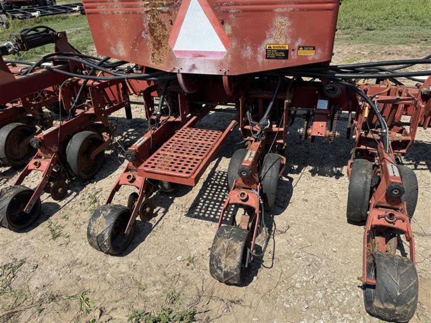 Case IH 950 Air Planter 8-row planter with 30in spacing. Central air seed delivery system. Equipped with marker arms, seed boxes, and fertilizer attachments. Ground-driven seed meters for accurate population control. Hydraulic fold frame for transport. Shows normal wear for age, complete and functional.
