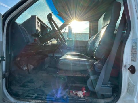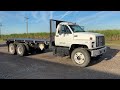 2002 Chevy C8500 dual-tandem flatbed. CAT 3126 Diesel Engine, Eaton Fuller 8-Speed Transmission (8 + Lo + Lo/Lo), 8ft x 21ft flat bed with perch for truck-mounted forklift, air brakes, vinyl seats, steel wheels, walking beam (mechanical) suspension, runs, drives, operates as it should.