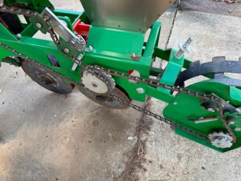 This LMC BYJ-2F two-row planter is as close to new as youll find without buying one straight from the factory. Its equipped with stainless steel seed and fertilizer boxes, a ground-driven chain system, and has only been used twice since purchase.