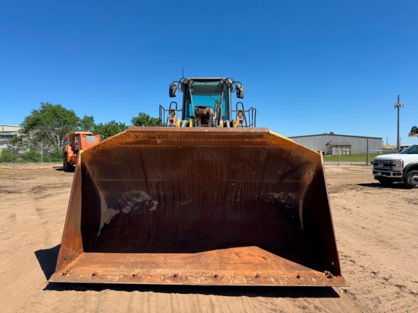 2013 John Deere 824K wheel loader with 14,352 hours, powered by a John Deere PowerTech Tier 3 engine and powershift transmission. Features include Z-bar linkage, quick coupler, auxiliary hydraulics, extra cameras, and a high-capacity bucket. Enclosed ROPS cab with heat and A/C. Operating weight around 60,000 lbs with a bucket capacity of 5.256.25 yd. Solid machine with strong hydraulics, good tires, and ready for work.