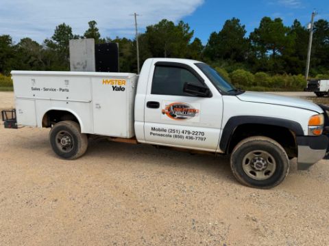 This 2002 GMC 2500HD 4x4 service truck runs and drives well and features the reliable GM 6.0L Vortec engine. The service body is in good condition, and all doors and drawers open and close properly. Equipped with a front-mounted winch for added utility.