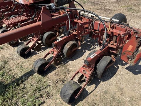 Case IH 950 Air Planter 8-row planter with 30in spacing. Central air seed delivery system. Equipped with marker arms, seed boxes, and fertilizer attachments. Ground-driven seed meters for accurate population control. Hydraulic fold frame for transport. Shows normal wear for age, complete and functional.