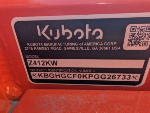 The Kubota Z412KW-48 is a 22 HP zero-turn mower with a 48-inch cutting deck, a Kawasaki engine, and a Hydro-Gear ZT3600 transmission. It has a top speed of 10 mph forward and 5 mph in reverse, a 6.8-gallon fuel tank, and features a steel-welded, 5-inch deep deck.
