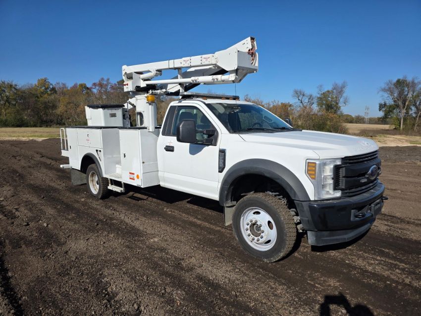 2019 F-550 bucket truck. This truck has the V-10 6.8L gas engine, automatic, 4x4, and only 58,300 miles. It is equipped with a 7 door utility bed and a Versalift SST40 boom. This gives a 45ft working height and a rotating bucket, and it has an abundance of safety strobe lighting installed. Please review the photos and video and call or text me with any questions. Terry at 601-665-5855