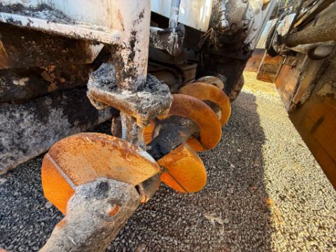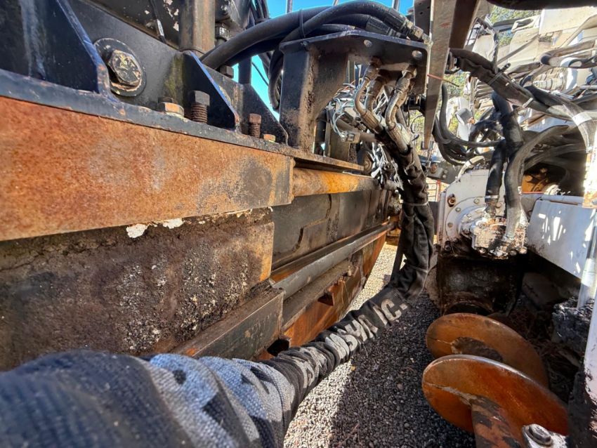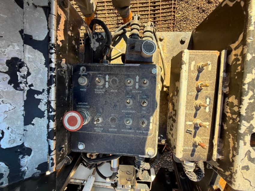 All work lights are functioning properly, making this paver ready for night or low-light operations. The feeder chain was visually inspected and appears to be in good condition, with smooth material flow observed. Augers and screed extensions were checked and operated as they should during inspection. This unit is equipped with Trimble receivers