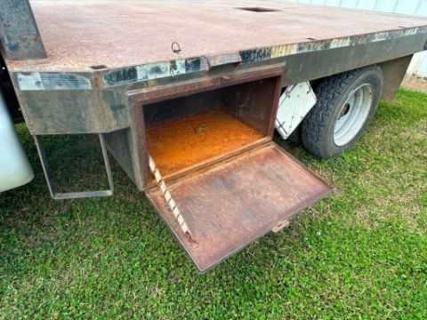 Work-truck condition. Surface rust present on flatbed, bumper, and wheels. Interior shows wear consistent with age and mileage (seat damage, cosmetic wear). Tires have usable tread. See photos for full condition details including frame and suspension components.