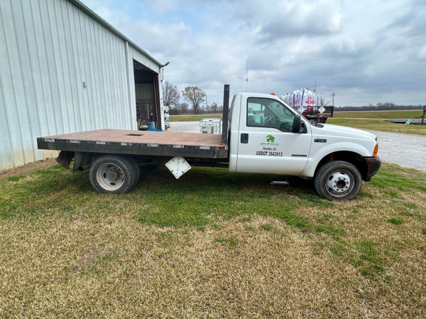 This 2001 Ford F-450 Super Duty is powered by the dependable 7.3L Power Stroke diesel engine paired with an automatic transmission. Regular cab configuration with heavy-duty steel flatbed and rear headache rack.