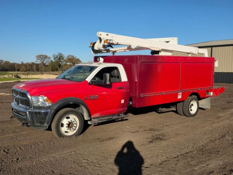 2017 Ram 5500 Bucket truck. This truck has the proven Cummins diesel with an automatic and only a little over 98,100 miles. It is equipped with a 4 roll up door enclosed bed, power inverter, with an Altec AT248F boom that has a 53ft working height walk in basket. Solid truck with nice racks inside the boxes, and the basket has both upper and lower controls. Review the photos and video and call or text with any questions! Terry at 601-665-5855