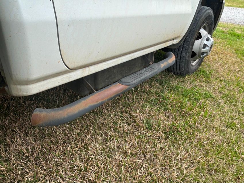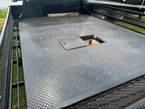 Flatbed is in solid condition with normal wear from use. Mesh sides and hinges appear functional. Interior is work-truck condition with visible dirt and wear consistent with farm/commercial use.